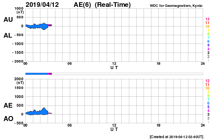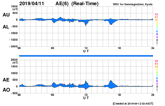 下段のAEグラフの値が高くなると、オーロラ活動が活発化しています。