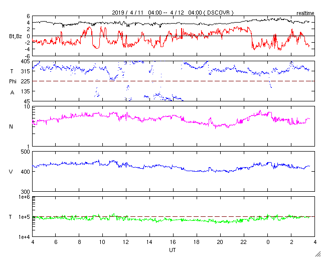 - 2019/ 4/10 12:08 太陽風は400km/秒台前半で推移しています。