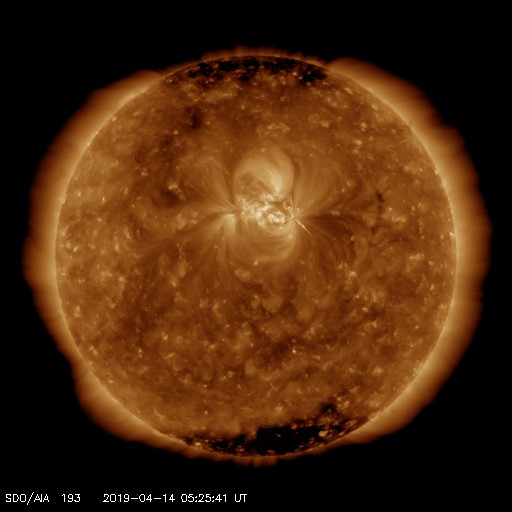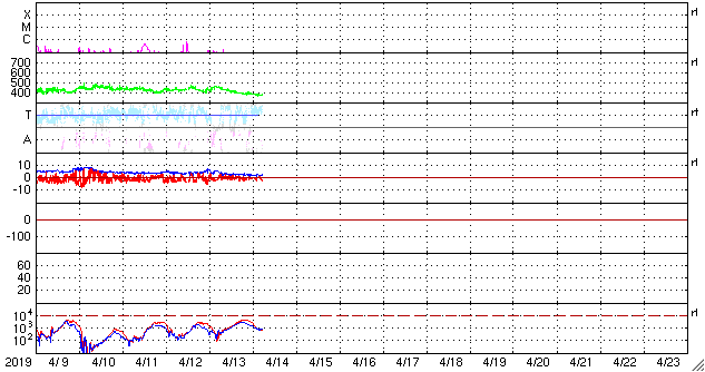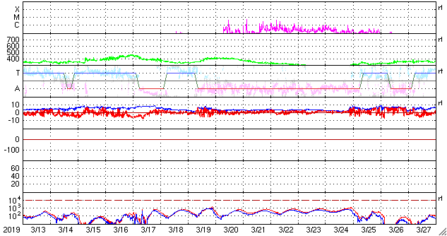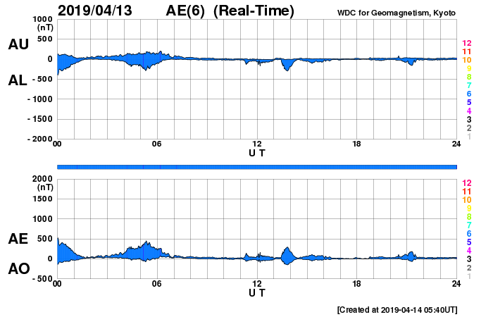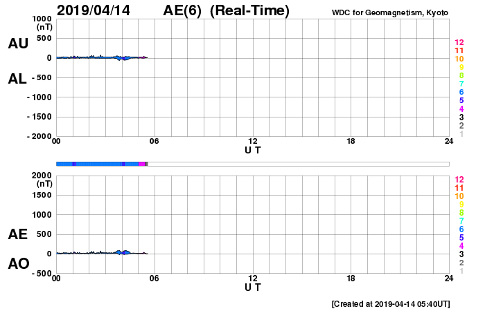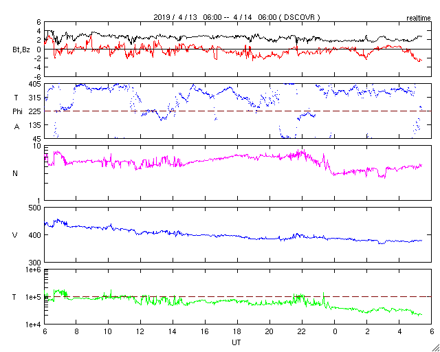 2019/ 4/14 14:36 更新 太陽風は低速になり、磁気圏も穏やかになっています。 担当 篠原 太陽風の速度は、昨日の午後からゆっくりと低下して、 370km/秒と低速の状態に変わっています。 磁場強度も、2nTに下がって弱くなっています。 太陽風磁場の南北成分は、 0nT付近で小さく変化する程度です。 速度が下がってきたこともあり、 磁気圏の活動は次第に小さくなっていて、 AE指数のグラフの後半は、変化が見られなくなっています。 SDO衛星AIA193の太陽コロナ写真では、 太陽の赤道や低緯度域にはコロナホールは見られません。 27日周期の図の前周期の変化の様に、 この後、低速の穏やかな太陽風が続きそうです。 太陽の2738黒点群は、 大きい黒点の周囲に小さい黒点が現れたり消えたりしていますが、 全体としては目立った変化はありません。 X線グラフでは、Bクラスの小さい変化も少なくなっていて、 活動度は下がっている様です。 ![]() SDO衛星のAIA193カメラによる太陽コロナの様子 (c) SDO (NASA) ![]() SDO衛星による太陽の可視光写真。マウスの矢印を写真に重ねると、黒点番号付きの写真に切り替わります。 (c) SDO (NASA) ![]() DSCOVRが観測した太陽風の磁場(1番上の枠、黒線は全体の強度、赤線は南北成分) および、太陽風の密度(3番目の紫線)、速度(4番目の青線) (c) データ:NOAA/SWPC、作図:宇宙天気ニュース ![]() AE指数(速報値) 下段のAEグラフの値が高くなると、オーロラ活動が活発化しています。 (c) 京都大学WDC ![]() ![]() 27日の太陽周期に合わせたデータプロット 太陽が同じ面を地球に向けていた27日前の変化から、今後を予想することができます。 (c) 作図:宇宙天気ニュース
