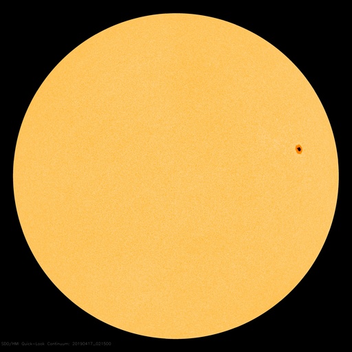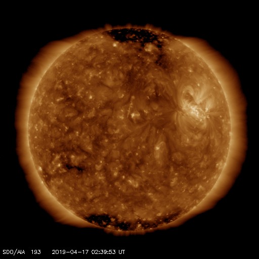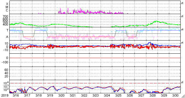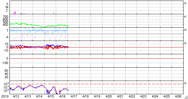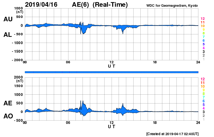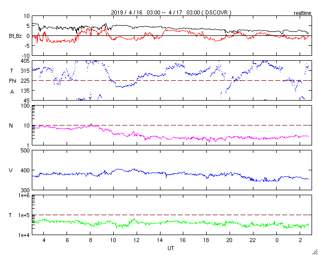 2019/ 4/17 11:57 更新 低速の太陽風が続いています。磁気圏も穏やかです。 担当 篠原 太陽風は、350〜380km/秒と 300km/秒台後半の速度で推移しています。 一方、磁場強度は2nTに下がり、弱まっています。 太陽風は、穏やかな風が続いています。 太陽風磁場の南北成分は、 磁場強度が下がっていることもあり、 小さく南北に変化しています。 磁気圏の活動は小さくなっていて、 AE指数は、初めの頃は500nTに達する変化が起きていますが、 後半は変化がなくなっています。 SDO衛星AIA193では、コロナホールは見られず、 穏やかな太陽風が続くでしょう。 太陽は、2738黒点群が西の端に近付いています。 特に活動は見られず、太陽は穏やかです。