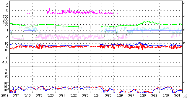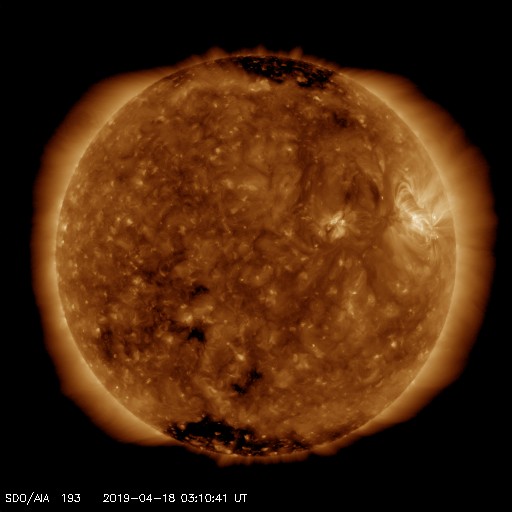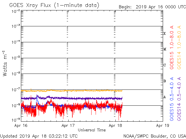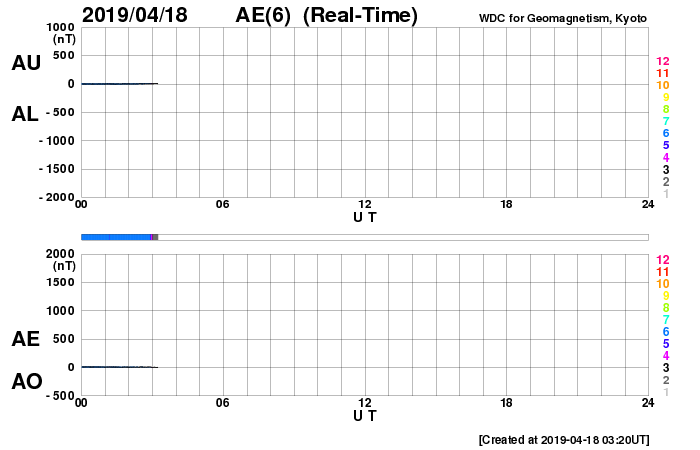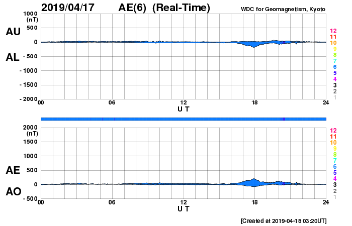 2019/ 4/18 12:28 更新 新しい黒点が発生しています。太陽風は更に低速になっています。 担当 篠原 昨日の夕方から、2738黒点群の左側に新しい黒点が現れ、 2739黒点群と番号が付けられています。 出現緯度は北緯5度と低く、 磁場の並びも現在の第24期の順番です。 フレア活動の高まりはなく、 X線グラフは変化のない状態が続いています。 太陽風は、速度が320km/秒に下がり、 更に低速になっています。 磁場強度は、2nTから4nTに少し上がって、 平均的な値に戻りかけています。 太陽風磁場の南北成分は、 全体としては北寄りの傾向になっています。 このため、AE指数のグラフは変化がなくなり、 一時的に磁場が南を向いた頃に、 200nTの小さい変化が起きているだけです。 SDO衛星AIA193では、 太陽の中央部に目立つコロナホールはなく、 低速の穏やかな太陽風が続きそうです。