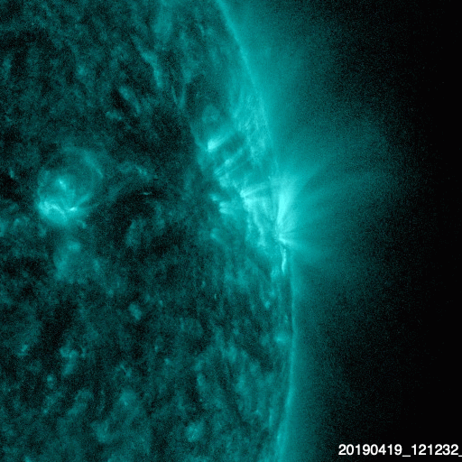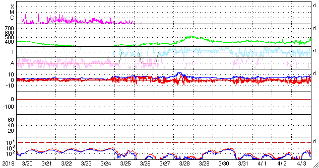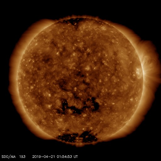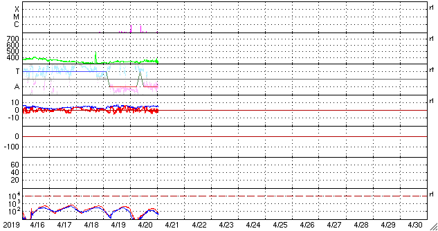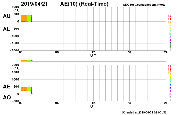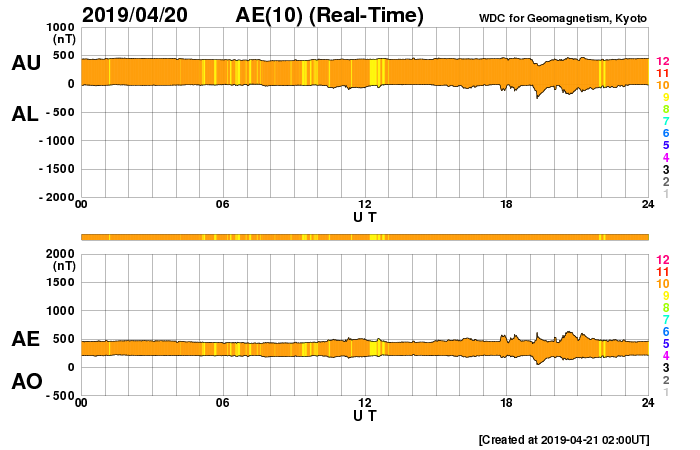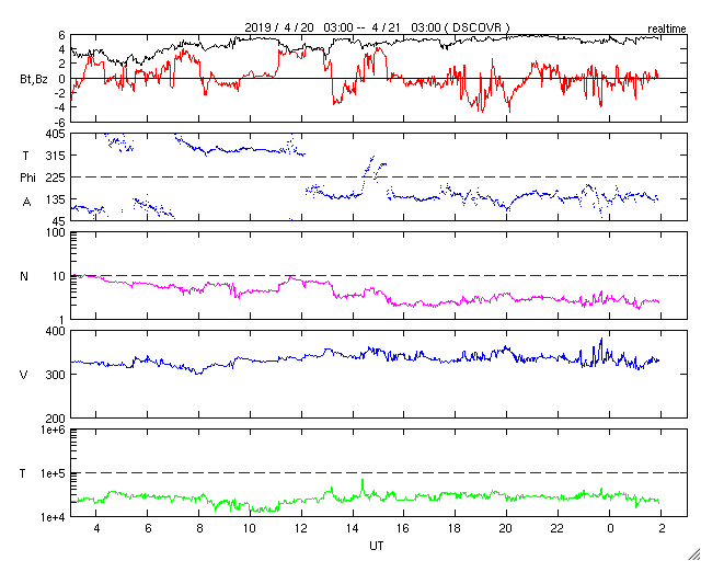 2019/ 4/21 11:02 更新 低速の太陽風が続いています。磁気圏も穏やかです。 担当 篠原 太陽風の速度は、320〜350km/秒と低速の状態が続いています。 磁場強度は、5nTと平均的な値で安定しています。 磁場の南北成分は、振れ幅は小さいですが、 時々、南向きに変化しています。 これに対応して、AE指数のグラフにも小さい変化が発生しています。 しかし、全体としては磁気圏は穏やかです。 SDO衛星AIA193の太陽コロナ写真では、 太陽の中央部の南側に、横方向にコロナホールが広がっています。 27日前の前周期よりも広がりは大きくなっています。 このため、27日周期の図の3月28〜29日にやって来た 太陽風速度の高まりよりも、 今回は変化が長く続いたり、 速度がより高まったりするかもしれません。 23日以降に注目してください。 太陽は、西に沈んでいった2738黒点群の領域で、 B8に続いて、B6の小さいフレアも起きています。 SDO衛星AIA131の動画で、この活動の様子を紹介します。 太陽の端近くで、小さい活動が頻繁に起きている様子が分かります。 一方、2739黒点群はだいぶ小さくなっていて、 掲載の可視光写真では、かろうじて見える程度です。 こちらも西の端に近付いていて、 この後、太陽は無黒点になりそうです。