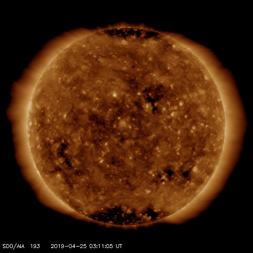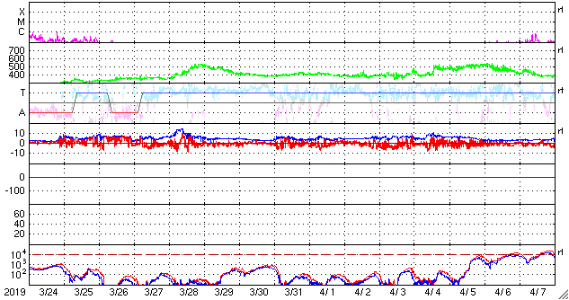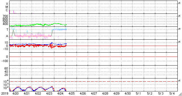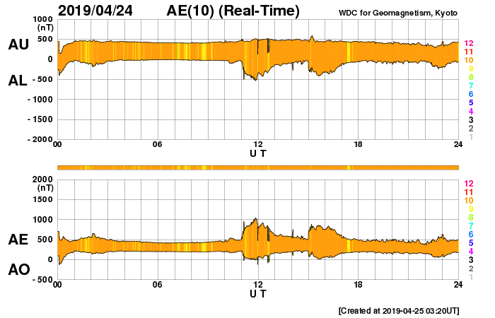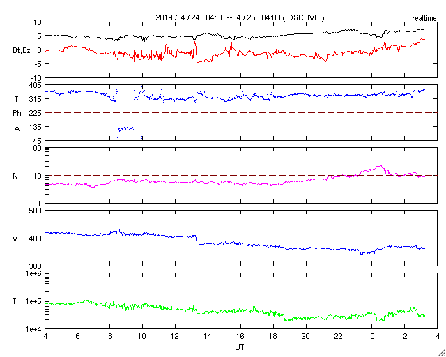 2019/ 4/25 12:29 更新 太陽風の速度はやや低速になっています。太陽は無黒点が続いています。 担当 篠原 太陽風の速度は、 昨夜、24日22時頃までは400km/秒台を保っていましたが、 以降は一段下がって、370km/秒とやや低速の状態になっています。 太陽風速度の高まりは、小さい変化で終わっています。 太陽風の磁場強度は、5nTから7nTに少しだけ上がっています。 この後、弱い速度の高まりがもう一度やって来るかもしれません。 太陽風磁場の南北成分は、弱い南寄りになっています。 このため、磁気圏では時々活動が高まって、 AE指数に中規模程度の変化を起こしています。 SDO衛星AIA193では、 太陽の中央部にはっきりしたコロナホールは見られません。 この後の太陽風は、基本的には穏やかな状態が続きそうです。 太陽は無黒点で、穏やかな状態が続いています。 ![]() SDO衛星のAIA193カメラによる太陽コロナの様子 (c) SDO (NASA) ![]() SDO衛星による太陽の可視光写真 (c) SDO (NASA) ![]() DSCOVRが観測した太陽風の磁場(1番上の枠、黒線は全体の強度、赤線は南北成分) および、太陽風の密度(3番目の紫線)、速度(4番目の青線) (c) データ:NOAA/SWPC、作図:宇宙天気ニュース ![]() AE指数(速報値) 下段のAEグラフの値が高くなると、オーロラ活動が活発化しています。 (c) 京都大学WDC ![]() ![]() 27日の太陽周期に合わせたデータプロット 太陽が同じ面を地球に向けていた27日前の変化から、今後を予想することができます。 (c) 作図:宇宙天気ニュース