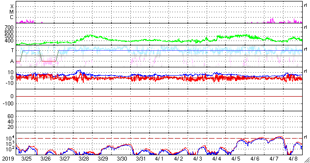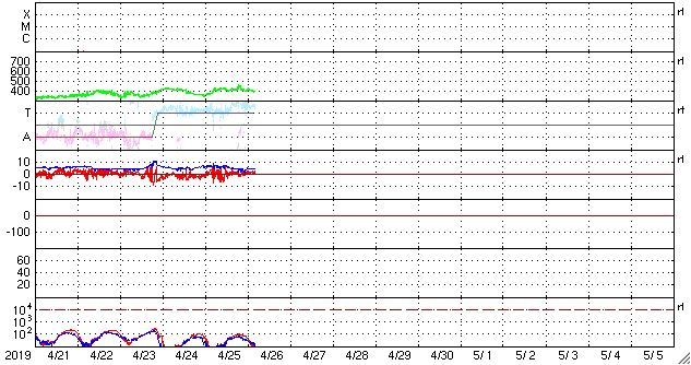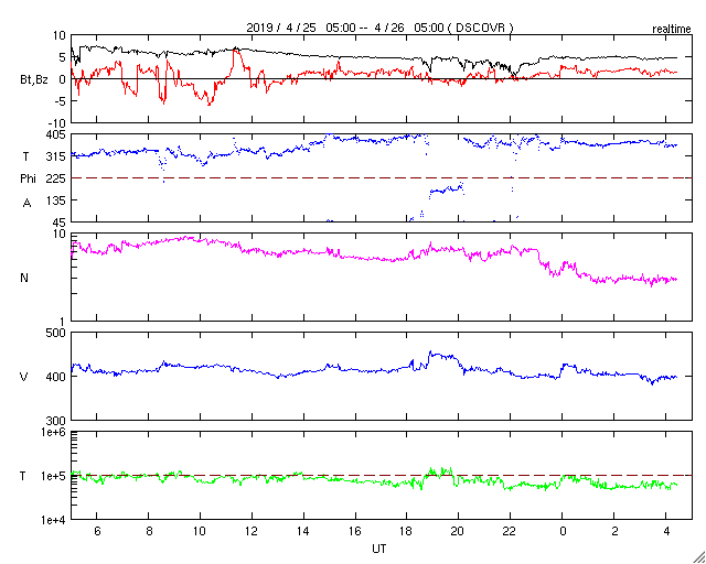 - 2019/ 4/23 12:37 太陽風は低速の傾向が続いています。この後コロナホールの影響が始まるかもしれません。