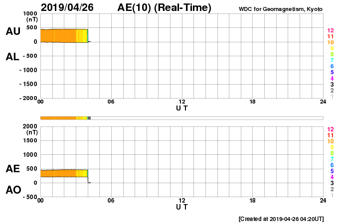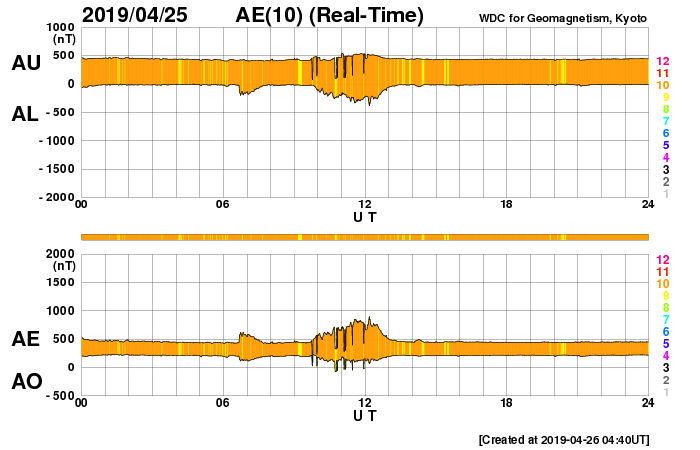 下段のAEグラフの値が高くなると、オーロラ活動が活発化しています。