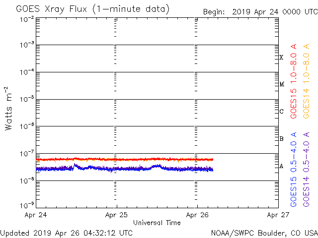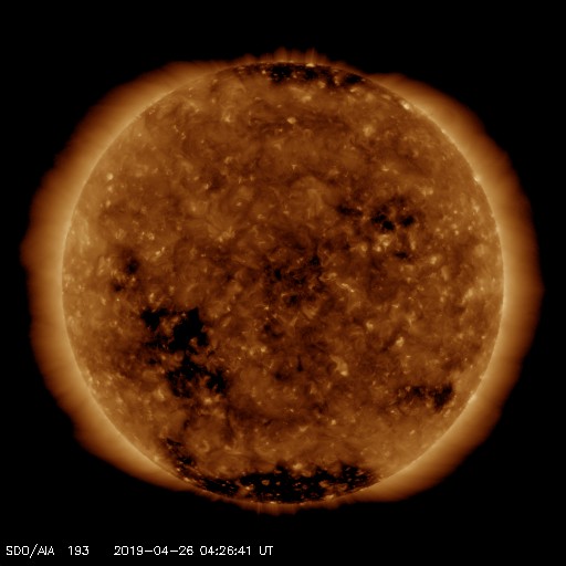 - 2019/ 4/22 13:30 低速の太陽風が続いています。太陽は無黒点になっています。