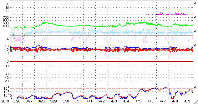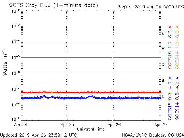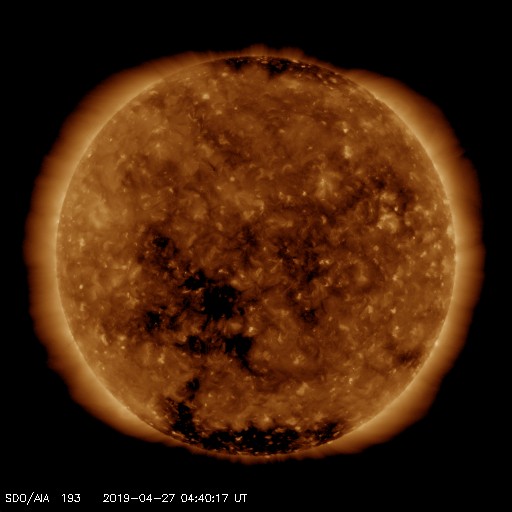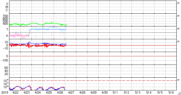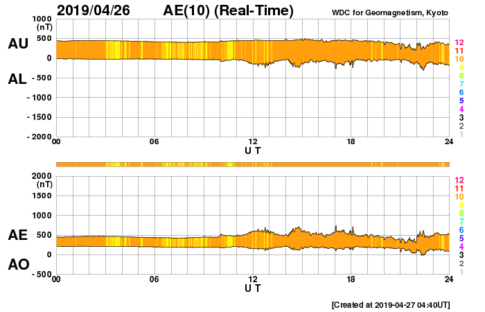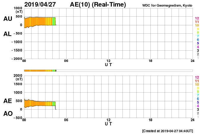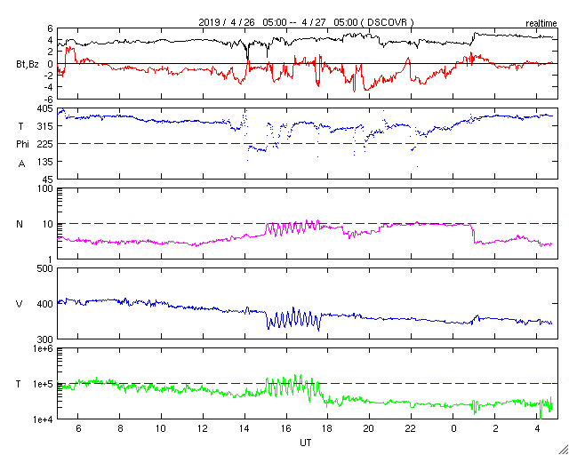 2019/ 4/27 13:57 更新 太陽風は低速になっています。しばらく低速の状態が続きそうです。 担当 篠原 太陽風の速度は350km/秒へ下がり、低速の風になっています。 磁場強度は、4nT前後と平均的な状態です。 太陽風磁場の南北成分は、 グラフの中盤で南寄りの傾向になっています。 磁気圏では小規模の活動が起きている様で、 AE指数のグラフは太い状態が続いていますが、 そこから小さい変化が度々発生しています。 しかし、太陽風のグラフの最後は0nT付近になっていて、 この状態が続くと、磁気圏は静穏になるでしょう。 SDO衛星AIA193の太陽写真では、 南東側(左下)のコロナホールが 昨日よりも良く見えるようになっています。 先頭(右端)は、太陽の中心線近くに達しています。 3〜4日後から太陽風速度の高まりが始まるかもしれません。 太陽は、黒点のない静かな状態が続いています。 X線グラフも変化はありません。