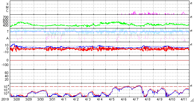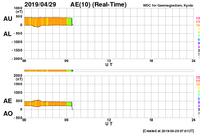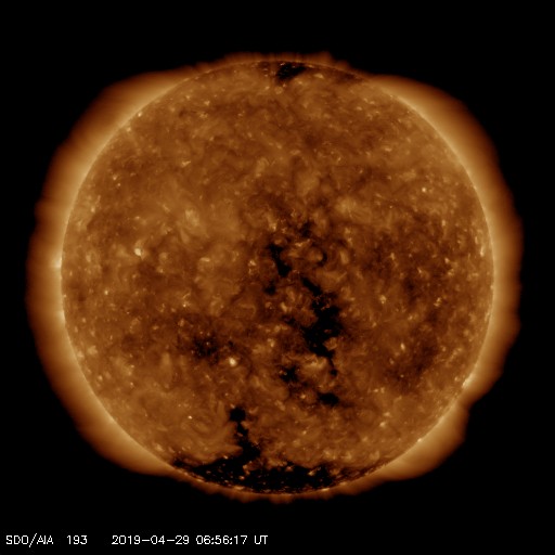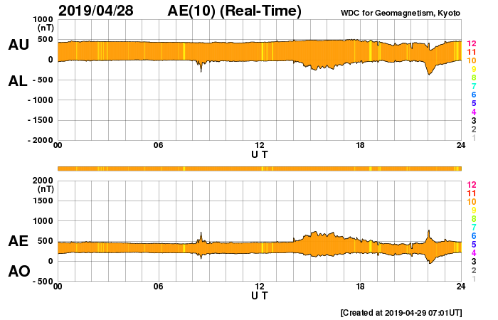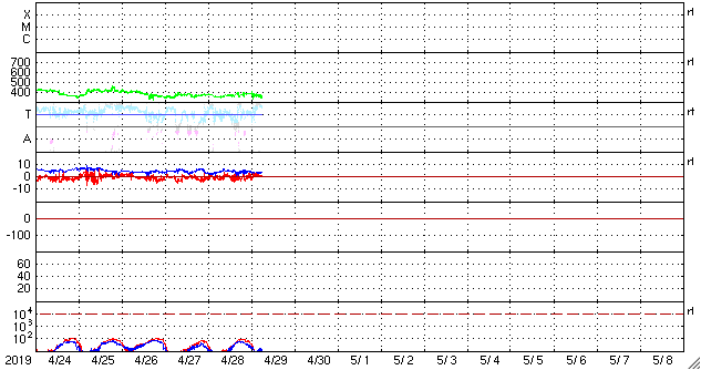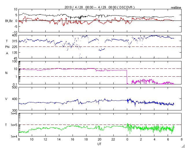 2019/ 4/29 16:07 更新 低速の太陽風が続いています。磁気圏も穏やかです。 担当 篠原 太陽風は、350〜370km/秒と低速の風が続いています。 磁場強度は、5nTから4nTに少し下がり気味ですが、 平均的な値で推移しています。 太陽風磁場の南北成分は、 0nTを挟んで小さく南北に変化する程度です。 AE指数は、小さい変化をする時間帯もありますが、 全体としては穏やかな状態が続いています。 SDO衛星AIA193の太陽写真では、 太陽中央部のコロナホールは太陽の西側に進んでいます。 明後日くらいから、太陽風の高まりが見られそうです。 東西の広がりがあまりないので、 変化は3日程度ではないでしょうか。 太陽は無黒点のままで、静かに推移しています。 ![]() SDO衛星のAIA193カメラによる太陽コロナの様子 (c) SDO (NASA) ![]() SDO衛星による太陽の可視光写真 (c) SDO (NASA) ![]() DSCOVRが観測した太陽風の磁場(1番上の枠、黒線は全体の強度、赤線は南北成分) および、太陽風の密度(3番目の紫線)、速度(4番目の青線) (c) データ:NOAA/SWPC、作図:宇宙天気ニュース ![]() AE指数(速報値) 下段のAEグラフの値が高くなると、オーロラ活動が活発化しています。 (c) 京都大学WDC ![]() ![]() 27日の太陽周期に合わせたデータプロット 太陽が同じ面を地球に向けていた27日前の変化から、今後を予想することができます。 (c) 作図:宇宙天気ニュース