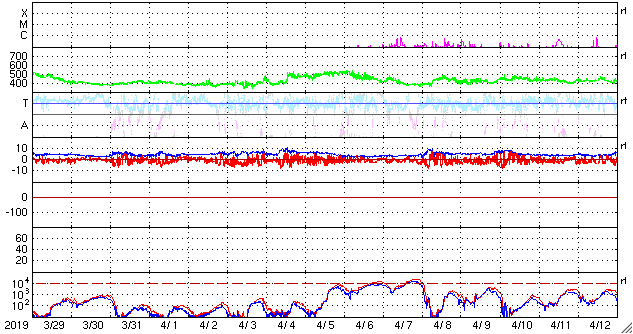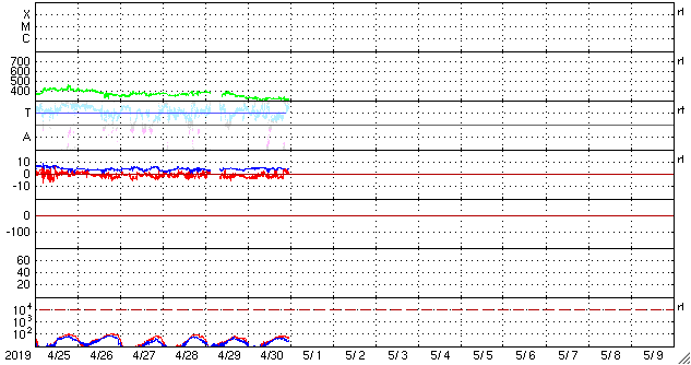 - 2019/ 4/26 13:40 太陽風は平均的な状態で、磁気圏も穏やかです。