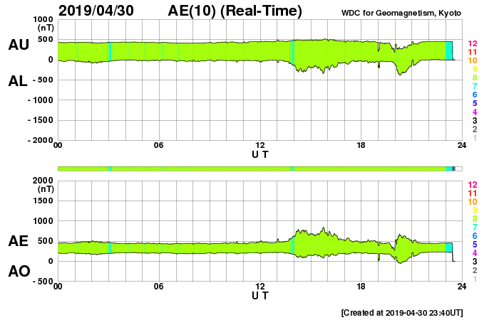 下段のAEグラフの値が高くなると、オーロラ活動が活発化しています。