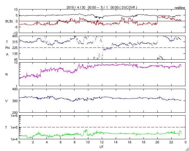 - 2019/ 4/29 16:07 低速の太陽風が続いています。磁気圏も穏やかです。