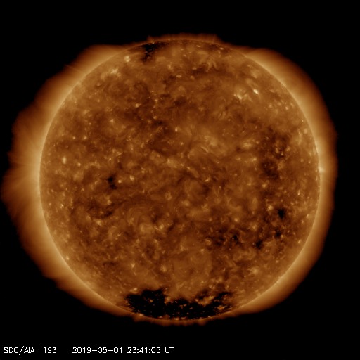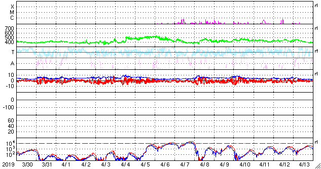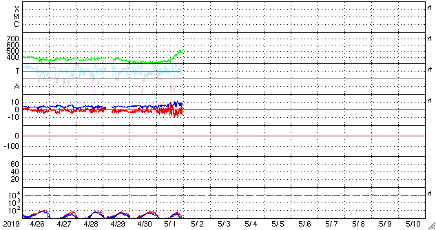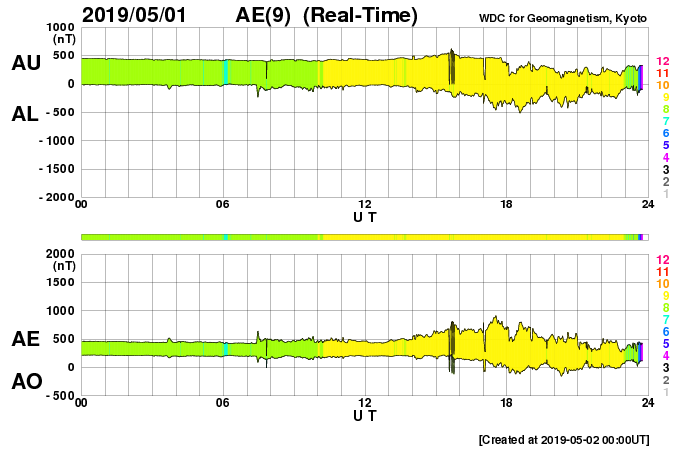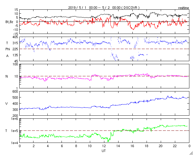 2019/ 5/ 2 08:55 更新 高速太陽風が始まりました。磁気圏の活動もやや高まっています。 担当 篠原 太陽風の速度は、昨夜遅くから上昇を始め、 300km/秒の低速風から、 現在は500km/秒の高速風に変わっています。 27日周期の図を見ると、 前周期と同じくらいのタイミングで速度の高まりが到来しています。 太陽風の磁場強度も、速度の高まりと共に少し強まり、 5〜10nTの間を変化しています。 磁場の南北成分は変化の幅が大きくなって、 -5〜-10nTの南向きの変化も発生しています。 速度の上昇と重なって、磁気圏の活動はある程度高まっています。 AE指数のグラフは、 小規模から中期後程度の変化になっている様です。 SDO衛星AIA193を見ると、 太陽風の高まりをもたらしているコロナホールは、 既に全体が西半球側(右側)に進んでいます。 太陽風の変化は、前周期と同様に2〜3日程度になりそうです。 太陽は、無黒点が続いています。 SDO衛星AIA193の太陽コロナ写真も、 全体がぼんやりと光っているだけで、 太陽活動の極小期らしい姿です。