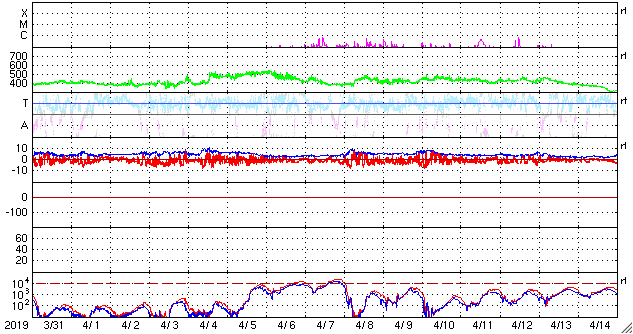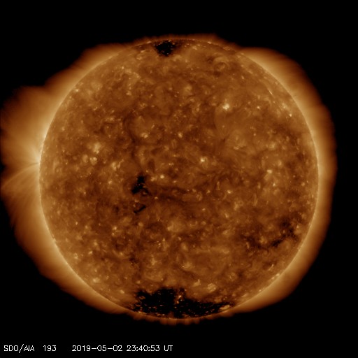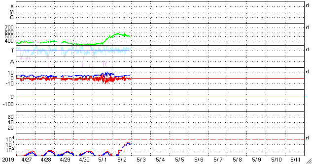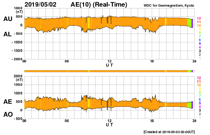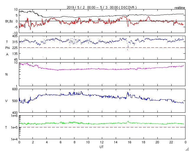 2019/ 5/ 3 08:56 更新 高速太陽風の速度は下がり始めています。 担当 篠原 太陽風の速度は、昨日の昼頃に550km/秒に達しました。 昨夜遅くまでこの速度が続きましたが、 その後は次第に低下して、 現在は480km/秒と既に500km/秒台を割っています。 磁場強度は5nTと平均的な状態です。 太陽風磁場の南北成分は、小幅で南北に変化しています。 速度が高まっているため磁気圏の活動はある程度高まっていて、 AE指数のグラフでは、小中規模の変化が続いている様です。 SDO衛星AIA193では、 コロナホールは太陽の西側に通り過ぎています。 太陽風の速度はこのまま下がっていきそうです。 太陽は無黒点で、 X線グラフはほとんど変化のない状態です。 SDO衛星AIAカメラや、STEREO Ahead衛星の画像によると、 太陽の東端の向こう側から活動的な領域が近付いています。 黒点が現れるでしょうか。