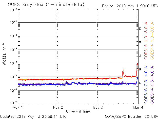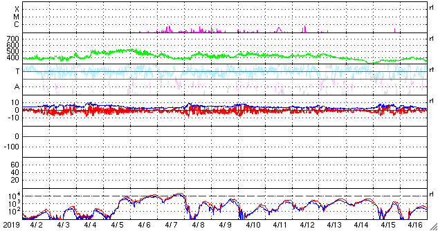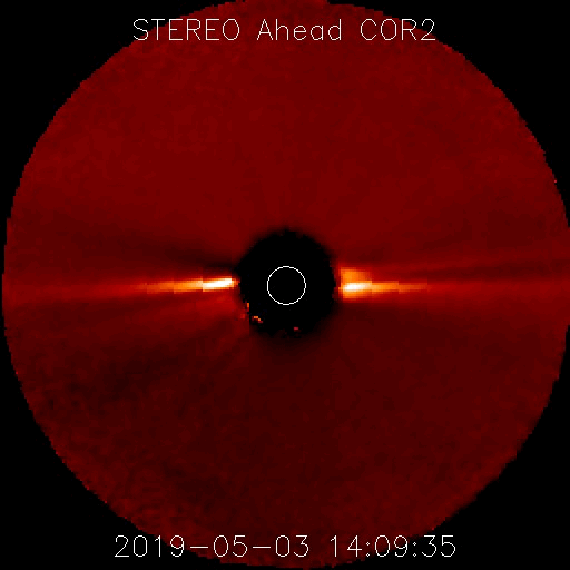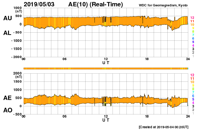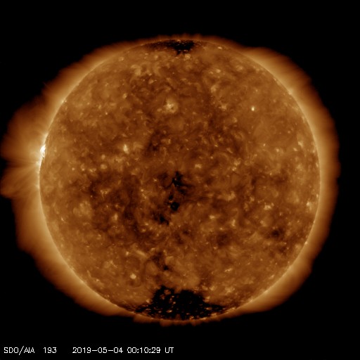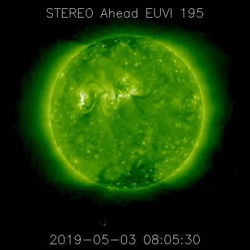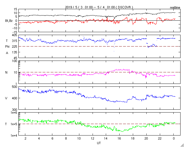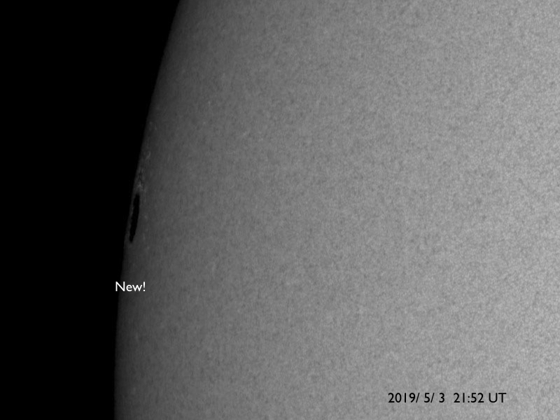 2019/ 5/ 4 09:25 更新 太陽の東端から黒点が現れました。この向こう側にかけて、活動的な領域が広がっています。 担当 篠原 太陽の東端から、新しい黒点が顔を出しています。 これは、4月中旬に見えていた2738黒点群が、 太陽の向こう側を回って帰ってきた姿の様です。 現れてすぐ、C1にぎりぎり届くくらいの フレアが発生しています。 まだ端から見え始めたばかりなので、 本当の規模はこれより大きかった可能性があります。 地球から向かって太陽の東側(左側)から観測を行っている STEREO Ahead衛星によると、 この黒点の向こう側にかけて活動的な領域が大きく広がり、 フレアやCME(太陽ガスの放出現象)などが活発に発生しています。 昨日、3日の活動の様子を、 EUVI 195とCOR2カメラの動画で紹介します。 EUVI 195の写真の中央部の明るい領域が、 地球側から見え始めた黒点です。 その向こう側(左側)にかけて、 明るい領域が大きく広がっています。 そして、爆発現象がこの領域の右側や左側で発生しています。 COR2の動画では、 太陽の左側に向かってCMEのガスが飛び出しています。 地球から見ると、太陽の向こう側に向かっているので、 影響はありません。 今日見え始めた黒点に続いて、 向こう側の領域が現れてくることになります。 今後、どの様な活動が見られるでしょうか。 太陽風は、昨夜までは450km/秒とやや高速の風が続いていましたが、 その後、400km/秒に下がり、平均的な速度に戻っています。 高速の太陽風は、2日ほどで終わりました。 一方、磁場強度は5nTから10nTにやや強まっています。 磁場の南北成分は、グラフの中盤までは小さい変化でしたが、 後半では -5nTくらいの南向きの変化も発生しています。 磁気圏は穏やかに推移していますが、 磁場が少し強まったことで、 小規模の変化が起きやすくなるかもしれません。 ![]() 太陽の東端から現れた新しい黒点。SDO衛星。 (c) SDO (NASA)、作図:宇宙天気ニュース ![]() 太陽の東端の向こう側の活動領域の様子。STEREO Ahead衛星EUVI 195。 (c) STEREO (NASA)、 (動画加工 : 宇宙天気ニュース) ![]() STEREO Ahead衛星から観測したCME。STEREO Ahead衛星COR2。 (c) STEREO (NASA)、 (動画加工 : 宇宙天気ニュース) ![]() SDO衛星のAIA193カメラによる太陽コロナの様子 (c) SDO (NASA) ![]() SDO衛星による太陽の可視光写真。マウスの矢印を写真に重ねると、黒点番号付きの写真に切り替わります。 (c) SDO (NASA) ![]() GOES衛星の太陽X線データ (c) NOAA/SWPC ![]() DSCOVRが観測した太陽風の磁場(1番上の枠、黒線は全体の強度、赤線は南北成分) および、太陽風の密度(3番目の紫線)、速度(4番目の青線) (c) データ:NOAA/SWPC、作図:宇宙天気ニュース ![]() AE指数(速報値) 下段のAEグラフの値が高くなると、オーロラ活動が活発化しています。 (c) 京都大学WDC ![]() ![]() 27日の太陽周期に合わせたデータプロット 太陽が同じ面を地球に向けていた27日前の変化から、今後を予想することができます。 (c) 作図:宇宙天気ニュース
