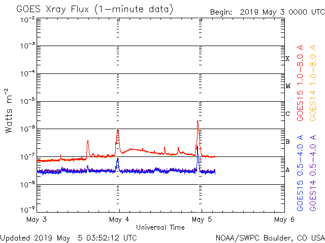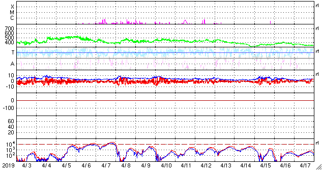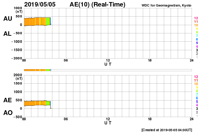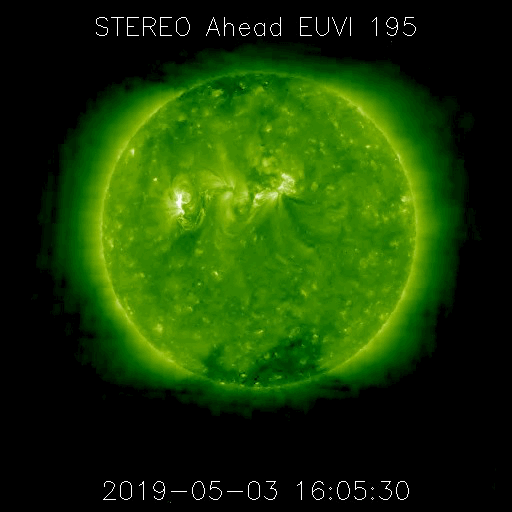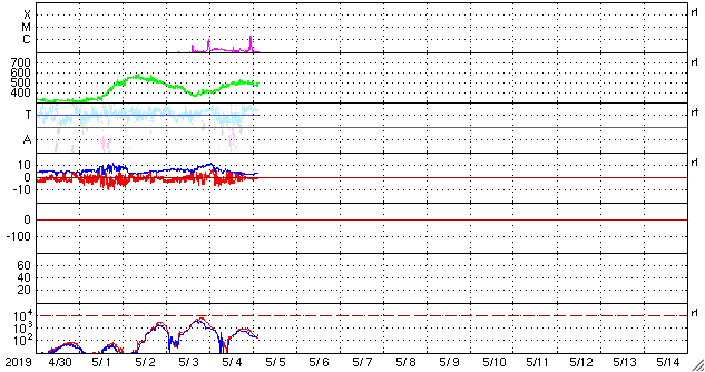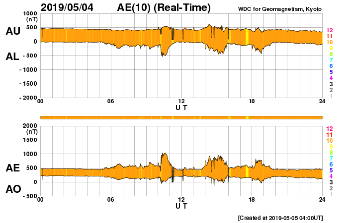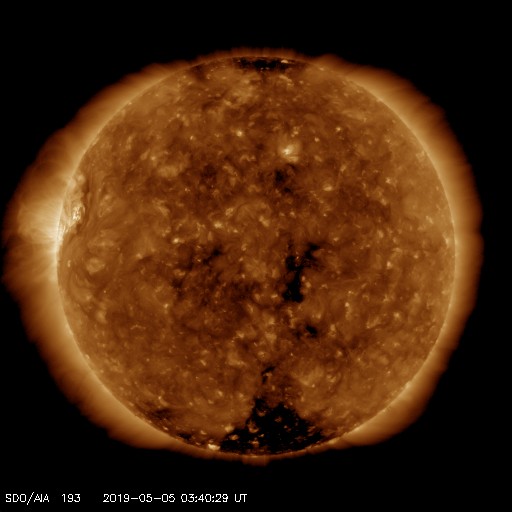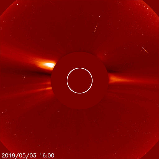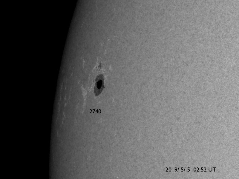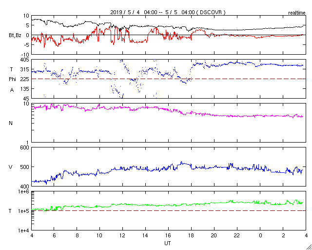 2019/ 5/ 5 13:00 更新 新しく現れた2740黒点群でフレアの活動が続いています。 担当 篠原 太陽の東側から現れた黒点は、2740黒点群と番号が付けられました。 昨日のニュースで、出現直後にC1.0フレアが観測された (4日8時、世界時3日23時)ことをお知らせしましたが、 このフレアは太陽の向こう側では、もっと大きな活動だった様で、 STEREO Ahead衛星のEUVI 195カメラでは、 激しい爆発の様子が観測されています。 もうひとつ前に発生した、更に遠くのフレアと合わせて、 EUVI 195の動画で紹介します。 この写真で、太陽の中心のやや右側で発生しているフレアが C1フレアに繋がる活動です。 地球から見える側で発生していたら、 どのくらいの規模になっていたのでしょうか。 このフレアに伴って、CME(太陽ガスの放出現象)も発生しています。 地球側に位置するSOHO衛星のLASCO C2、C3の動画を掲載します。 地球から見ると、太陽の左側で発生した現象なので、 CMEのガスも左側に飛び出しています。 2740黒点群では、今朝、5日7時半(世界時4日22時半)に、 C2.1の小規模フレアが発生しています。 この後、更に向こう側の領域も見えて来ます。 どの様な活動になるのか注目してください。 太陽風は、昨日の午後から速度が上がり始め、 夜には500km/秒の高速風に達しました。 現在も480km/秒とやや高速の風が続いています。 一方、太陽風の磁場強度は、速度と反対に次第に下がり、 現在は4nT程で安定しています。 磁気圏は、AE指数に小中規模の変化が発生する時間帯が見られますが、 以降は静かになっています。 ![]() 太陽の東端の2740黒点群。SDO衛星。 (c) SDO (NASA)、作図:宇宙天気ニュース ![]() 世界時3日後半に発生した、2740黒点群の向こう側の領域の活動の様子。STEREO Ahead衛星EUVI 195。 (c) STEREO (NASA)、 (動画加工 : 宇宙天気ニュース) ![]() 地球側から撮影された、太陽の向こう側の活動で発生したCMEの様子。SOHO衛星LASCO C2、C3。 (c) SOHO (ESA & NASA)、 (動画加工 : 宇宙天気ニュース) ![]() SDO衛星のAIA193カメラによる太陽コロナの様子 (c) SDO (NASA) ![]() SDO衛星による太陽の可視光写真。マウスの矢印を写真に重ねると、黒点番号付きの写真に切り替わります。 (c) SDO (NASA) ![]() GOES衛星の太陽X線データ (c) NOAA/SWPC ![]() DSCOVRが観測した太陽風の磁場(1番上の枠、黒線は全体の強度、赤線は南北成分) および、太陽風の密度(3番目の紫線)、速度(4番目の青線) (c) データ:NOAA/SWPC、作図:宇宙天気ニュース ![]() AE指数(速報値) 下段のAEグラフの値が高くなると、オーロラ活動が活発化しています。 (c) 京都大学WDC ![]() ![]() 27日の太陽周期に合わせたデータプロット 太陽が同じ面を地球に向けていた27日前の変化から、今後を予想することができます。 (c) 作図:宇宙天気ニュース