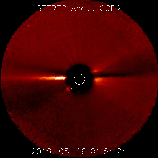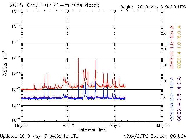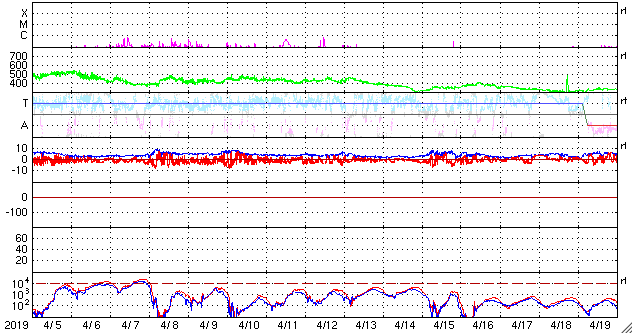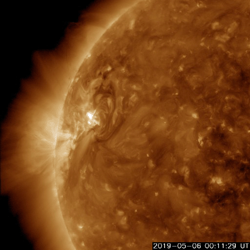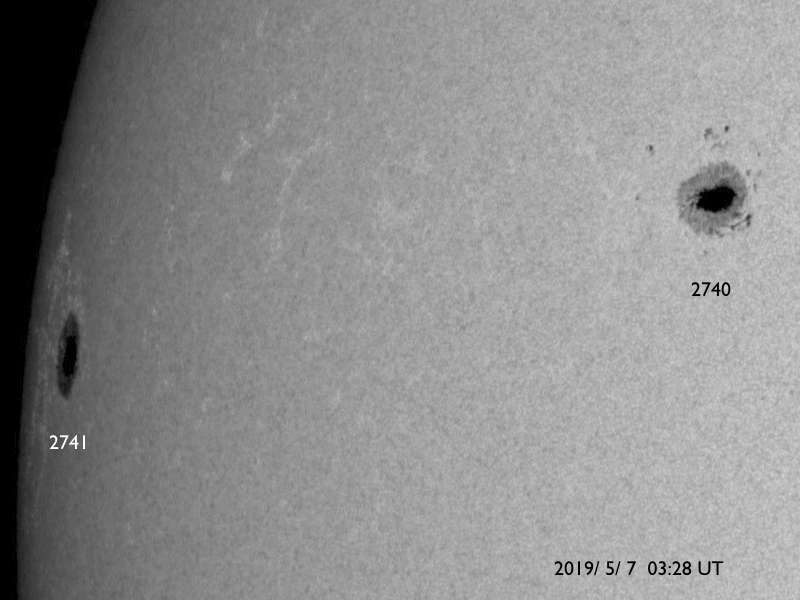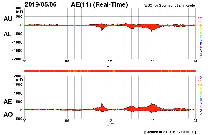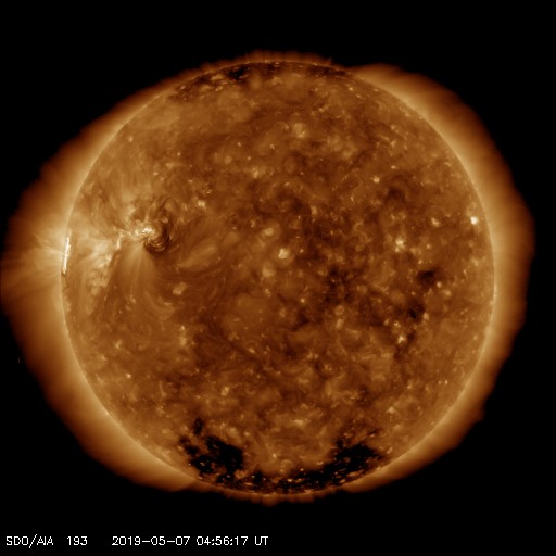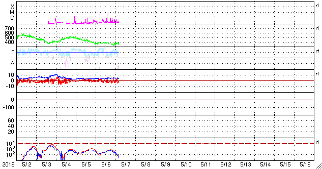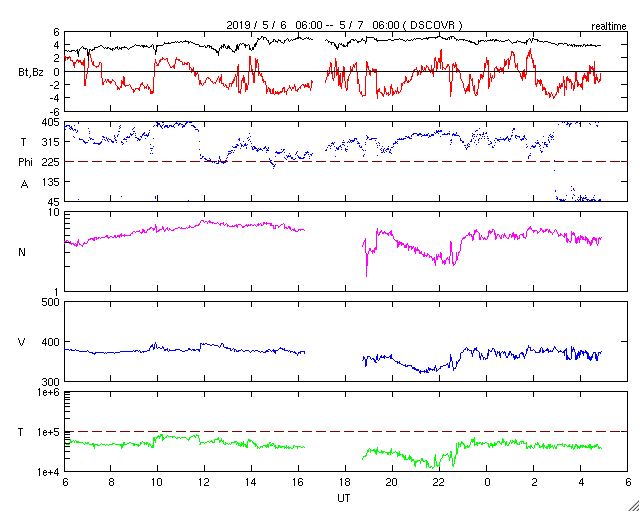 2019/ 5/ 7 14:02 更新 C9.9など小規模フレアの発生が続いています。 担当 篠原 2740黒点群の活発な活動が続いています。 昨日のニュースの直後、6日14時(世界時6日5時)には、 C9.9とあと一歩でMクラスに達する規模の 小規模フレアが発生しました。 この規模のフレアは、 1年半前の2017年10月20日に発生したM1.1以来です。 2740黒点群では、 その後も6日22時半(世界時6日13時半)にC7.3など、 小規模フレアの発生が続いています。 活動の様子を、SDO衛星AIA193の動画で紹介します。 また、STEREO Ahead衛星のCOR2によると、 これらのフレアに伴ってCME(太陽ガスの放出現象)も発生し、 STEREO Ahead衛星から右方向(地球のある方向)に コロナのガスが飛び出しています。 3日後くらいに太陽風の乱れが到来するかもしれません。 そして、太陽の東端から次の黒点が現れ、 2741黒点群と番号が付けられています。 こちらの領域はどの様な活動度になっているでしょうか。 引き続き注目してください。 太陽風は、370km/秒とやや低速の状態が続いています。 磁場強度は4〜5nTと平均的な状態です。 磁場の南北成分は、小幅ですが南北に変化しています。 磁気圏では小規模の活動が起きている様で、 AE指数には、300〜400nTの小規模の変化が発生しています。