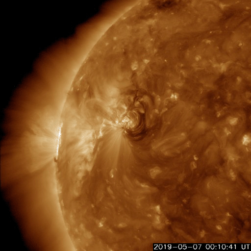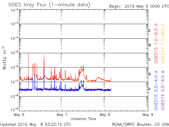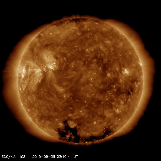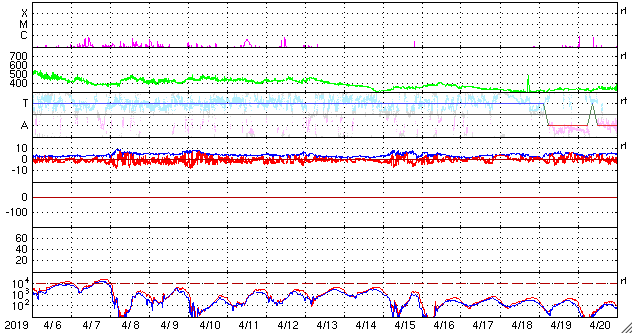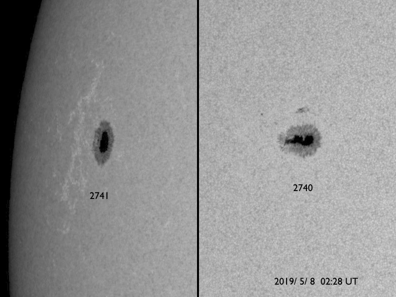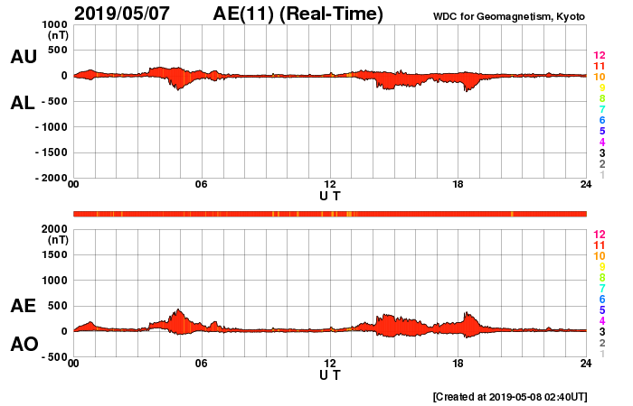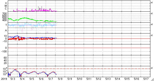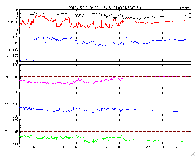 2019/ 5/ 8 12:30 更新 2740黒点群の活動は続いています。太陽風は低速です。 担当 篠原 2740黒点群に続いて現れた2741黒点群も、 次第によく見える様になってきました。 昨日から今日にかけてのSDO衛星AIA193の動画を掲載します。 右側の2740黒点群の方がより活発に活動を起こしています。 7日21時(世界時7日12時)のC1.4の小規模フレアでは、 周囲のガスを吹き飛ばす様子も見えています。 この爆発では、CME(太陽ガスの放出現象)も発生しています。 また、左側の2741黒点群でも、 動画の最後の頃に爆発が起きています。 X線グラフでは、Bクラスの弱い高まりとして観測されています。 引き続き、これらの黒点群の活動に注目して下さい。 太陽風は、370km/秒から340km/秒へ下がり、 さらに低速になっています。 磁場強度も、3nTとやや弱くなっています。 磁場の南北成分は、南寄りになる時間帯があり、 この頃、AE指数は小規模の変化が発生しています。 その後、磁場の南北成分は0nT付近で小さくなっていて、 磁気圏も静かになっています。 SDO衛星AIA193では、 太陽の中央部にコロナホールは見られません。 今後、CMEによる乱れが到来する可能性がありますが、 それがなければ、太陽風は穏やかな状態が続きそうです。