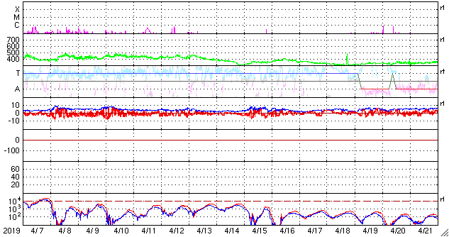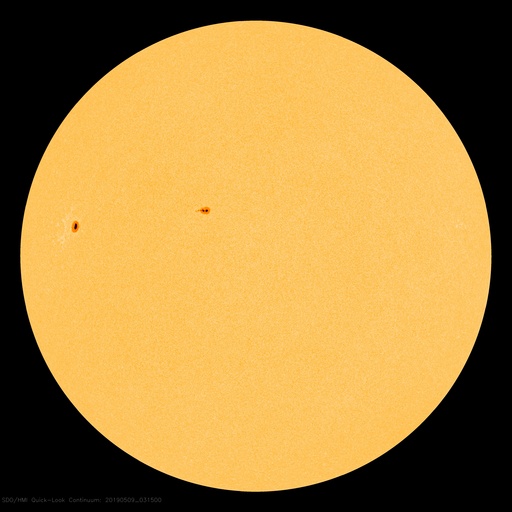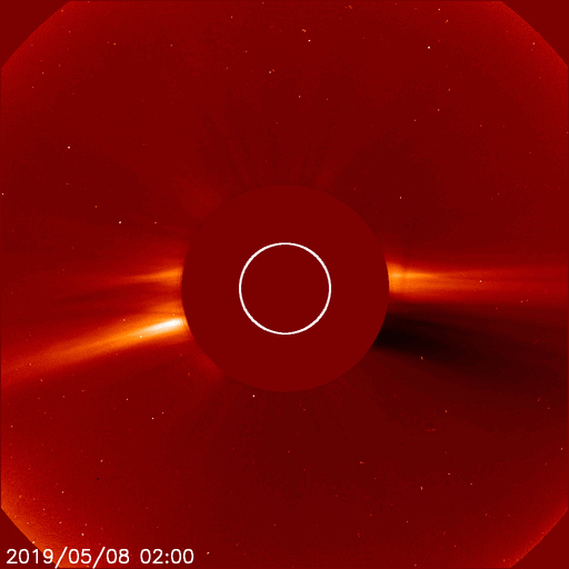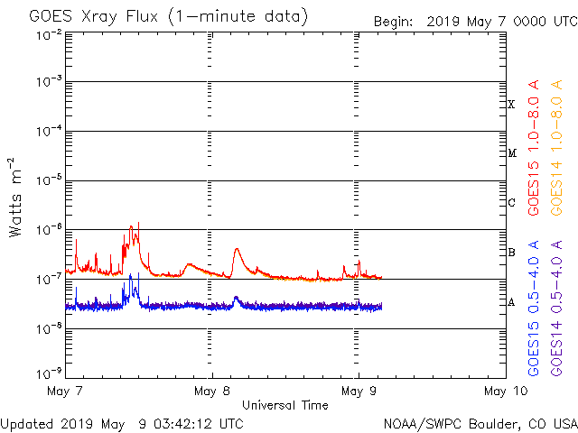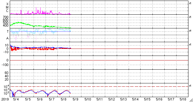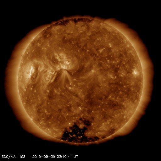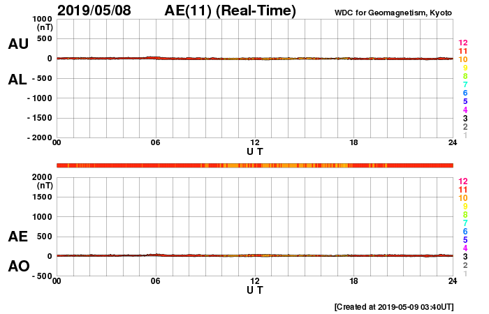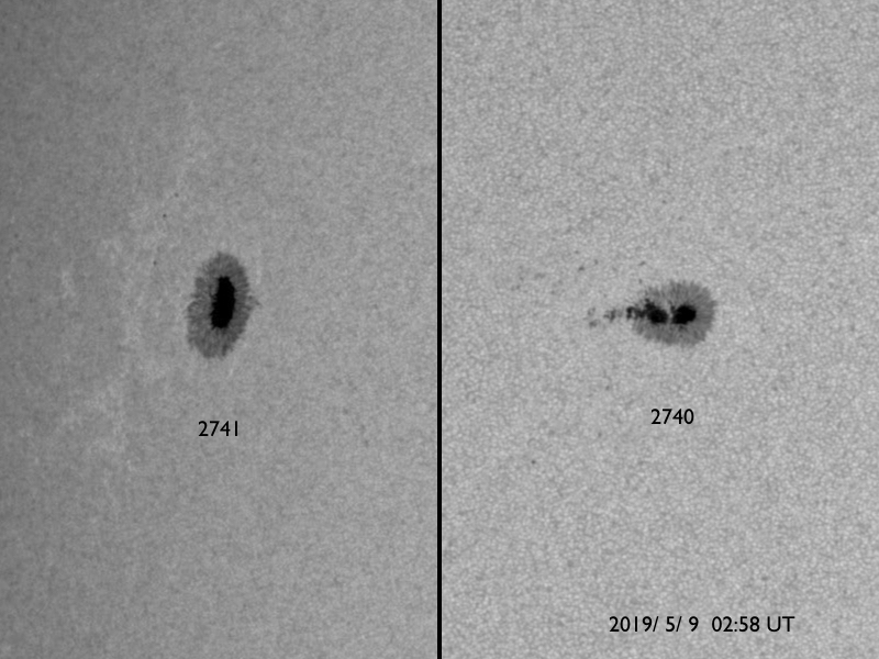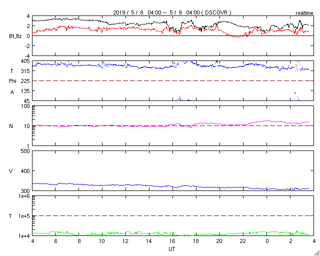 2019/ 5/ 9 12:50 更新 フレアは少なくなっています。太陽風は更に低速になっています。 担当 篠原 2740黒点群、2741黒点群は、 可視光写真の見え方にあまり変化はありませんが、 X線グラフの変化はだいぶ少なくなっています。 昨日の昼、8日12時(世界時8日3時)頃に、 Bクラスの長時間型の高まりが発生した程度です。 この活動では、CME(太陽ガスの放出現象)も噴出していて、 SOHO衛星のLASCO C2、C3によると、 太陽の左に向かってガスが飛び出しています。 地球に対して横向きなので、影響はないでしょう。 2つ黒点群は、このまま静かになっていくのでしょうか。 引き続き注目してください。 太陽風は、速度が310km/秒へ下がり、 更に低速になっています。 磁場強度も、2nTと弱くなっています。 磁場の南北成分は、 振れ幅も小さいですが、北寄りの傾向です。 速度の低下もあり、磁気圏はとても穏やかになっています。 AE指数は、全く変化が見られません。 ![]() 2740(右)、2741(左)黒点群の拡大写真。SDO衛星。 (c) SDO (NASA)、作図:宇宙天気ニュース ![]() 2741黒点群付近から太陽の左に向かって噴出するCME。SOHO衛星LASCO C2、C3。 (c) SOHO (ESA & NASA)、 (動画加工 : 宇宙天気ニュース) ![]() SDO衛星のAIA193カメラによる太陽コロナの様子 (c) SDO (NASA) ![]() SDO衛星による太陽の可視光写真。マウスの矢印を写真に重ねると、黒点番号付きの写真に切り替わります。 (c) SDO (NASA) ![]() GOES衛星の太陽X線データ (c) NOAA/SWPC ![]() DSCOVRが観測した太陽風の磁場(1番上の枠、黒線は全体の強度、赤線は南北成分) および、太陽風の密度(3番目の紫線)、速度(4番目の青線) (c) データ:NOAA/SWPC、作図:宇宙天気ニュース ![]() AE指数(速報値) 下段のAEグラフの値が高くなると、オーロラ活動が活発化しています。 (c) 京都大学WDC ![]() ![]() 27日の太陽周期に合わせたデータプロット 太陽が同じ面を地球に向けていた27日前の変化から、今後を予想することができます。 (c) 作図:宇宙天気ニュース