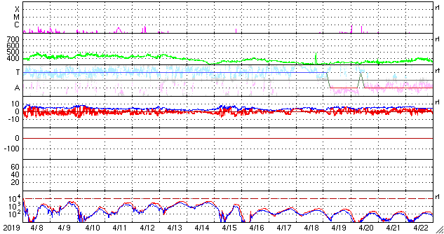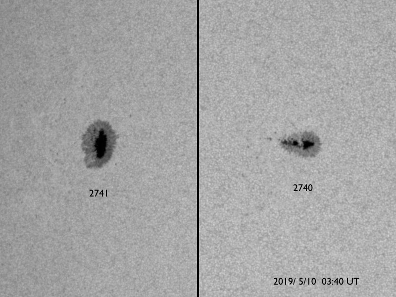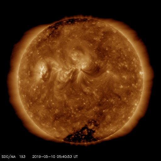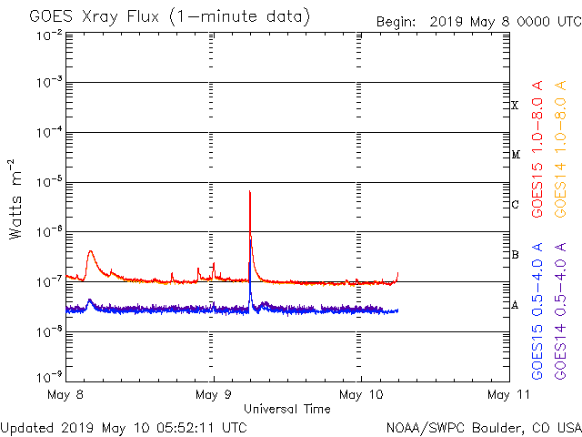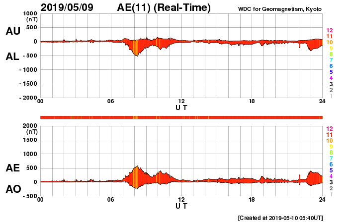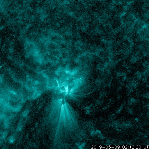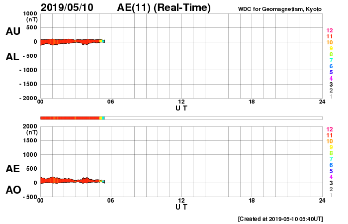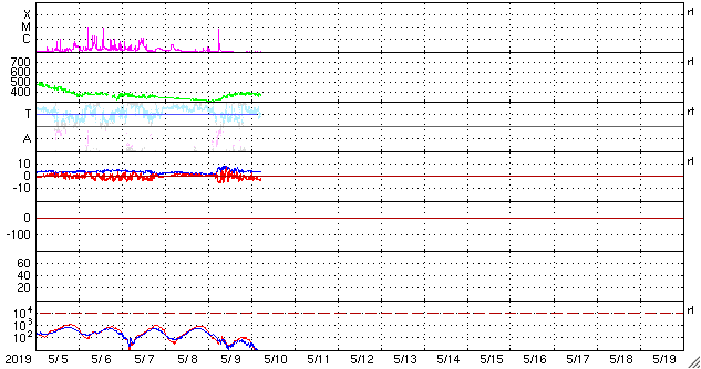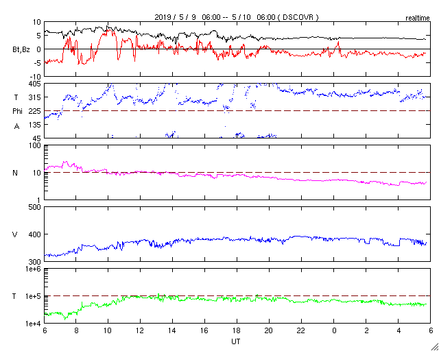 2019/ 5/10 14:56 更新 C6.7の小規模フレアが発生しました。太陽風はやや低速です。 担当 篠原 昨日のニュースの後、9日14時班(世界時9日5時半)に、 2740黒点群でC6.7の小規模フレアが発生しました。 X線グラフに変化が見られなくなって、 静かになってきたと思ったところでの発生でした。 SDO衛星AIA131、193の動画を掲載します。 爆発とともにガスが噴き上がる様子も見えていますが、 目立つ程のCMEは発生していません。 2740黒点群は、その後は特にフレアを起こしておらず、 太陽は静かになっています。 太陽風は、昨日の午後に速度が少し高まり、 380km/秒とやや低速の状態になっています。 磁場強度は、速度が高まる頃に7nTくらいになりましたが、 その後は4nTに下がっています。 磁場が少し高まった頃に南向きの変化も発生し、 AE指数に500nTの中規模の変化を起こしています。 その後は、弱い南寄りになって、 AE指数は小さい変化が見られる程度です。 この後、C9.9のフレアの時のCMEによる 弱い変化が見られるかもしれません。 それがなければ、太陽風は穏やかに推移するでしょう。 ![]() 2740黒点群で発生したC6.7のフレア。SDO衛星AIA131、193。 (c) SDO (NASA)、(動画加工 : 宇宙天気ニュース) ![]() 2740(右)、2741(左)黒点群の拡大写真。SDO衛星。 (c) SDO (NASA)、作図:宇宙天気ニュース ![]() SDO衛星のAIA193カメラによる太陽コロナの様子 (c) SDO (NASA) ![]() SDO衛星による太陽の可視光写真。マウスの矢印を写真に重ねると、黒点番号付きの写真に切り替わります。 (c) SDO (NASA) ![]() GOES衛星の太陽X線データ (c) NOAA/SWPC ![]() DSCOVRが観測した太陽風の磁場(1番上の枠、黒線は全体の強度、赤線は南北成分) および、太陽風の密度(3番目の紫線)、速度(4番目の青線) (c) データ:NOAA/SWPC、作図:宇宙天気ニュース ![]() AE指数(速報値) 下段のAEグラフの値が高くなると、オーロラ活動が活発化しています。 (c) 京都大学WDC ![]() ![]() 27日の太陽周期に合わせたデータプロット 太陽が同じ面を地球に向けていた27日前の変化から、今後を予想することができます。 (c) 作図:宇宙天気ニュース