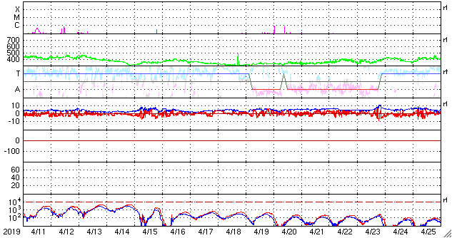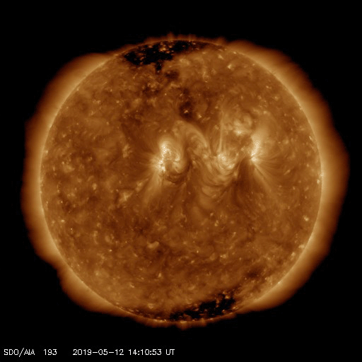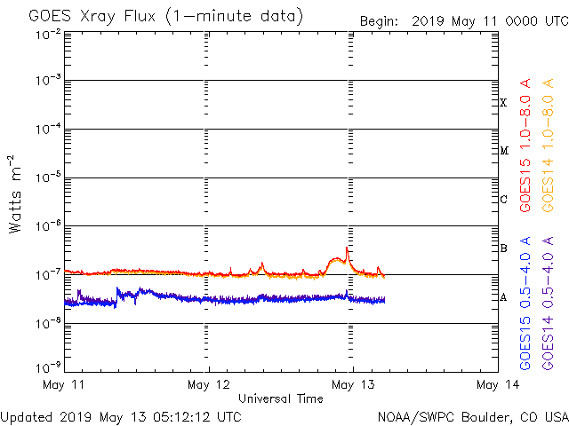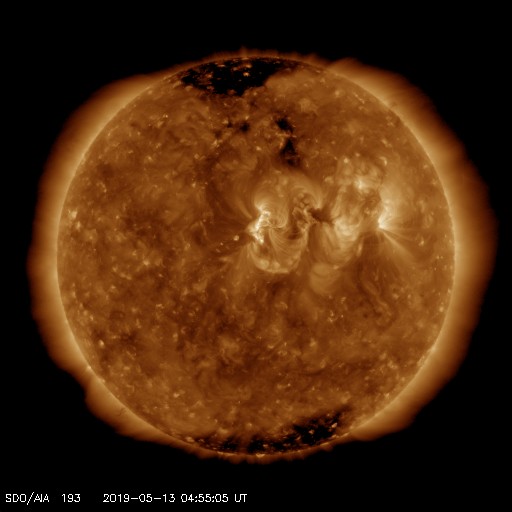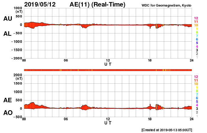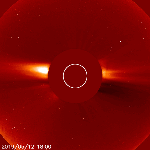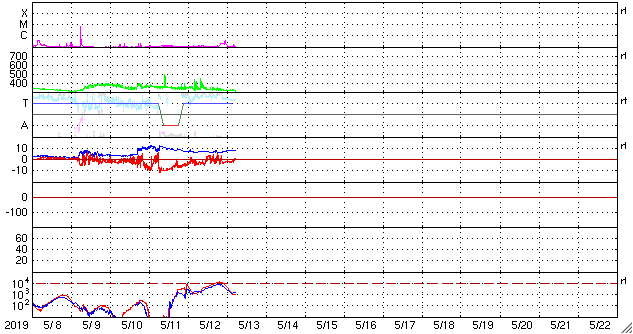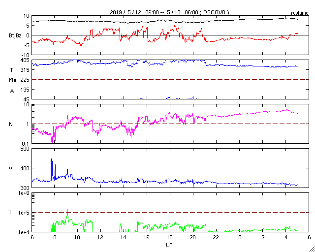 2019/ 5/13 14:11 更新 太陽風は更に低速になっています。淡いCMEが発生しています。 担当 篠原 太陽風磁場の南向きの変化は昨夜くらいに一旦終わり、 今朝にかけて0nTを挟んで南北に変化する様になりました。 その後、小さい南向きになって現在まで続いています。 磁場強度は、6nTから8nTと、 やや高まった状態が続いています。 太陽風の速度は、 350km/秒から320km/秒へ下がっています。 磁場の南向きの変化も終わって、 太陽風は穏やかな低速風になっています。 太陽は、右の2740黒点群は更に小さくなって、 左の2741黒点群だけが目立っています。 今朝、13日4時(世界時12日19時)頃に、 この黒点群の周辺で、 フィラメント噴出の様な弱い爆発が発生し、 X線グラフにB2程度の小さい変化を起こしています。 SDO衛星AIA193による動画を掲載します。 この爆発に伴ってCME(太陽ガスの放出現象)が発生し、 SOHO衛星LASCO C2、C3によると、 太陽全体を囲む様に広がるハロー型のCMEになっています。 とても淡いCMEですが、LASCO C2、C3の動画を掲載します。 太陽の中心部で発生しているので、 4〜5日後くらいに太陽風の乱れが地球に到来するかもしれません。 その場合、速度の変化は特に見られず、 磁場の強まりがやって来るのではないかと思います。