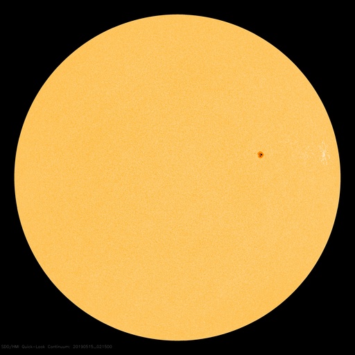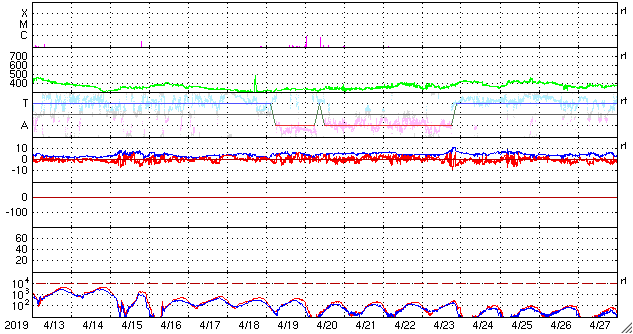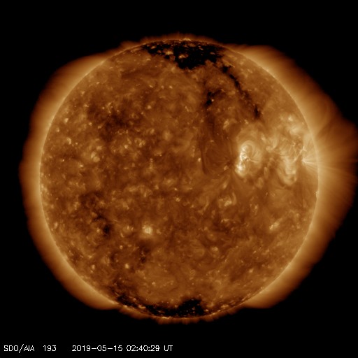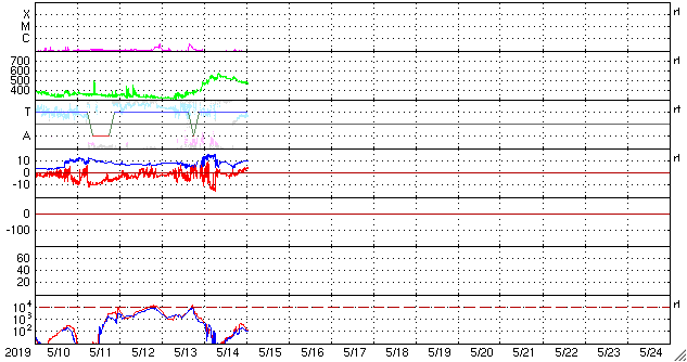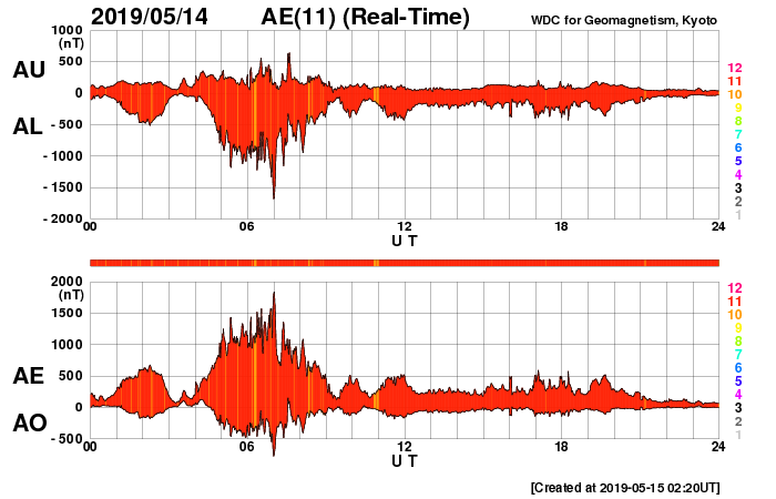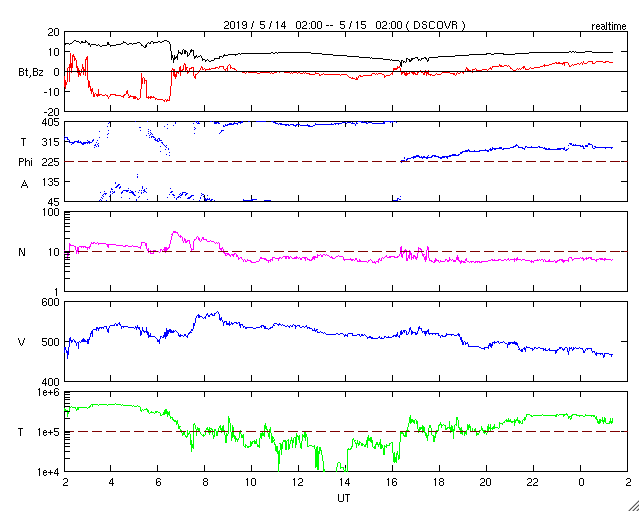 2019/ 5/15 11:56 更新 高速太陽風の速度は下がり始めています。磁気圏の活動も落ち着いています。 担当 篠原 太陽風は、今朝早くまで500km/秒台の高速の風が続きました。 現在は少し下がって、460km/秒とやや高速です。 一方、磁場強度は、 昨日の午後に15nTから10nTに一段下がりましたが、 現在までこの状態が続いています。 磁場の南北成分は、昨日のニュースのしばらく後まで -10nTを超えて南向きに強まった状態が続き、 AE指数は1800nTに達する激しい変化になっています。 その後、南北成分は0nT付近に下がり、 今朝からは弱い北向きになっています。 このため、磁気圏の活動も 今朝までは300〜500nTの小規模の変化が続きましたが、 グラフの最後は変化がなくなっています。 昨日、一昨日のニュースでお知らせした様に、 13日、14日に弱いCMEが発生しています。 今後、この影響がやって来る可能性があります。 太陽の2740黒点群はさらに小さくなっています。 2741群も次第に縮小している様です。 X線グラフも特に変化はなく、穏やかです。 ![]() SDO衛星のAIA193カメラによる太陽コロナの様子 (c) SDO (NASA) ![]() SDO衛星による太陽の可視光写真。マウスの矢印を写真に重ねると、黒点番号付きの写真に切り替わります。 (c) SDO (NASA) ![]() DSCOVRが観測した太陽風の磁場(1番上の枠、黒線は全体の強度、赤線は南北成分) および、太陽風の密度(3番目の紫線)、速度(4番目の青線) (c) データ:NOAA/SWPC、作図:宇宙天気ニュース ![]() AE指数(速報値) 下段のAEグラフの値が高くなると、オーロラ活動が活発化しています。 (c) 京都大学WDC ![]() ![]() 27日の太陽周期に合わせたデータプロット 太陽が同じ面を地球に向けていた27日前の変化から、今後を予想することができます。 (c) 作図:宇宙天気ニュース