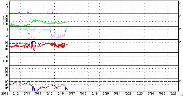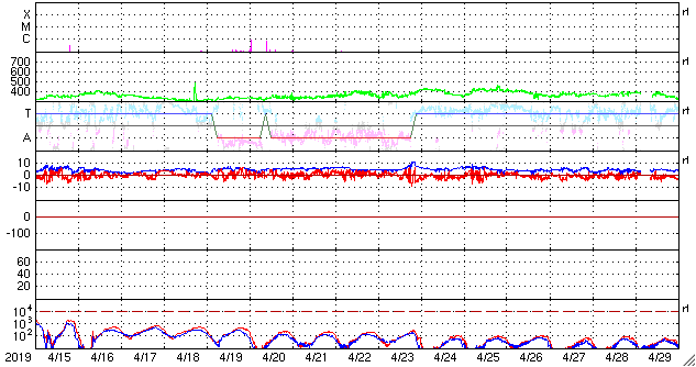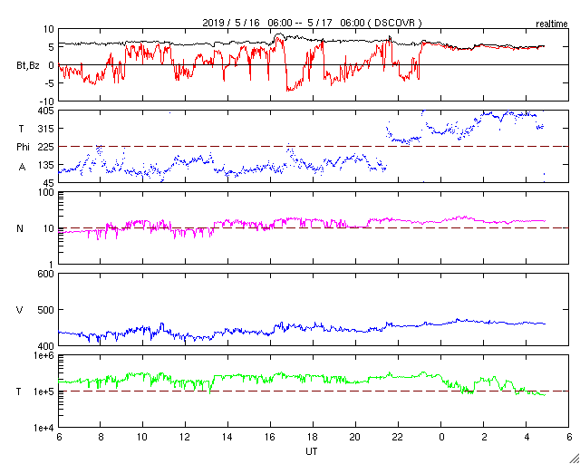 - 2019/ 5/15 11:56 高速太陽風の速度は下がり始めています。磁気圏の活動も落ち着いています。