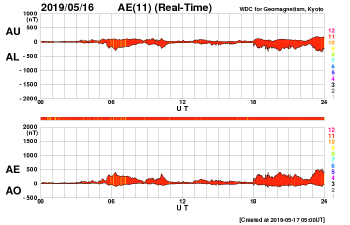 下段のAEグラフの値が高くなると、オーロラ活動が活発化しています。