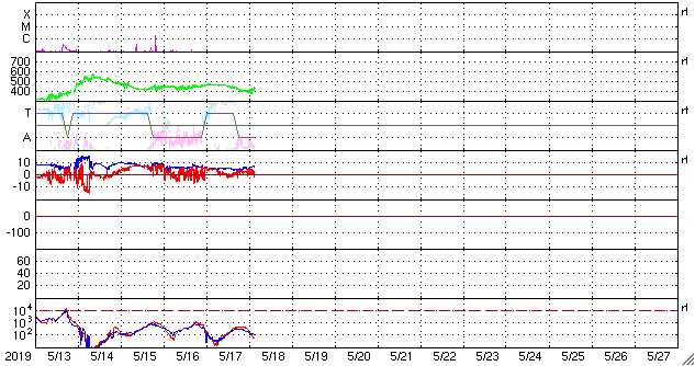 - 2019/ 5/15 11:56 高速太陽風の速度は下がり始めています。磁気圏の活動も落ち着いています。