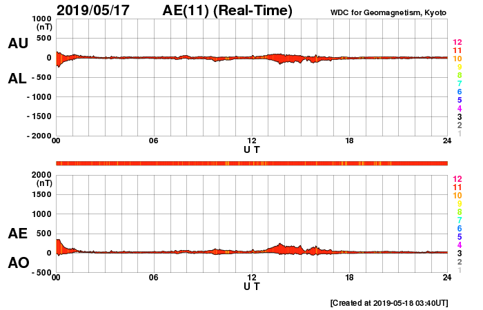 下段のAEグラフの値が高くなると、オーロラ活動が活発化しています。
