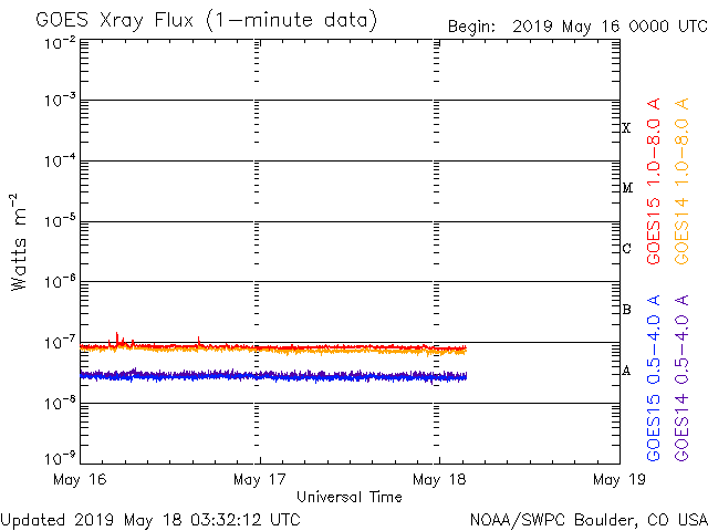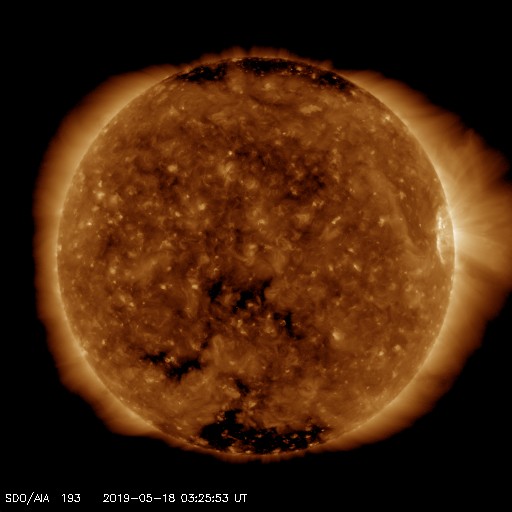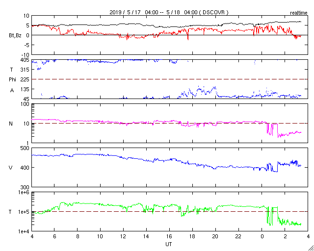 - 2019/ 5/17 14:03 やや高速の太陽風が続いています。太陽は穏やかな状態です。