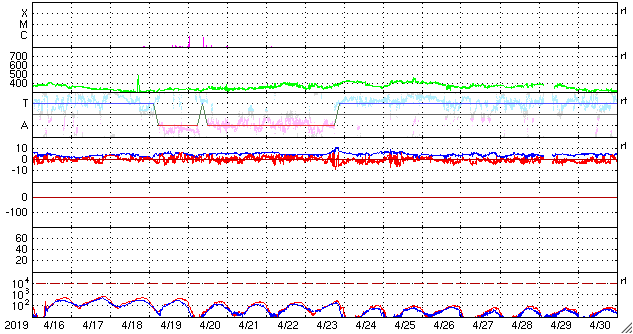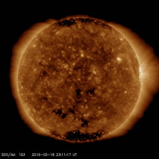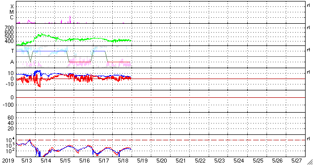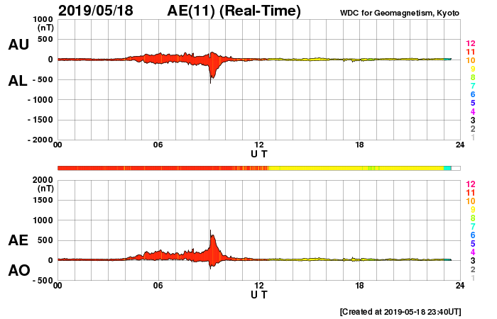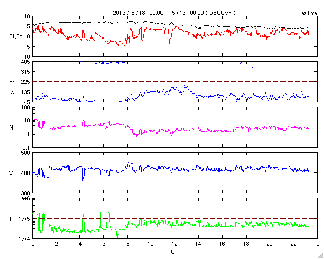 2019/ 5/19 08:26 更新 太陽風は平均的な状態で、磁気圏は穏やかです。2741黒点群は沈みかけています。 担当 篠原 太陽風は、400〜420km/秒と平均的な速度で安定しています。 磁場強度は、6nTから4nTヘ少し下がっています。 磁場の南北成分は北寄りの傾向になっていて、 磁気圏は基本的に穏やかです。 その中で、太陽風の磁場が南向きに変化した時間帯があり、 AE指数で600nTの中規模の活動が発生しています。 SDO衛星AIA193では、 太陽の南半球側に、細長いコロナホールが見えています。 2〜3日後にこの領域の弱い影響がやって来るかもしれません。 太陽では、2741黒点群が西の端に沈みかけています。 この後、太陽は無黒点になりそうです。 X線グラフには、特に変化はありません。 ![]() SDO衛星のAIA193カメラによる太陽コロナの様子 (c) SDO (NASA) ![]() SDO衛星による太陽の可視光写真。マウスの矢印を写真に重ねると、黒点番号付きの写真に切り替わります。 (c) SDO (NASA) ![]() DSCOVRが観測した太陽風の磁場(1番上の枠、黒線は全体の強度、赤線は南北成分) および、太陽風の密度(3番目の紫線)、速度(4番目の青線) (c) データ:NOAA/SWPC、作図:宇宙天気ニュース ![]() AE指数(速報値) 下段のAEグラフの値が高くなると、オーロラ活動が活発化しています。 (c) 京都大学WDC ![]() 27日の太陽周期に合わせたデータプロット 太陽が同じ面を地球に向けていた27日前の変化から、今後を予想することができます。 (c) 作図:宇宙天気ニュース