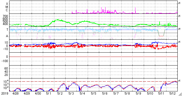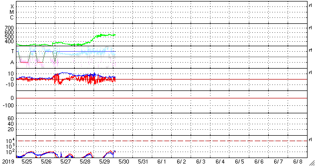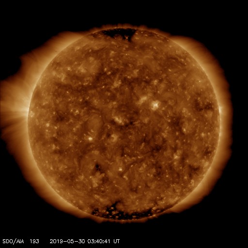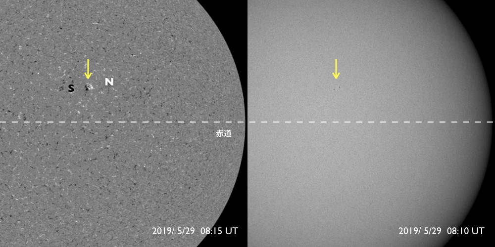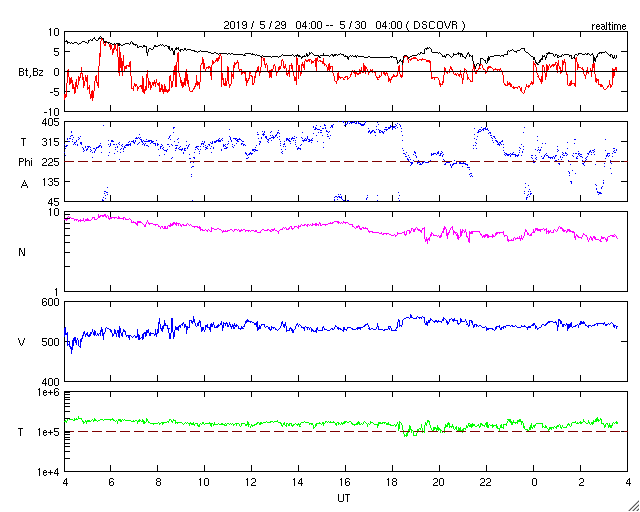 2019/ 5/30 12:47 更新 高速太陽風が続き、磁気圏の活動もやや高まっています。小さい黒点が現れました。 担当 篠原 太陽風の速度は、昨日のニュースの後に530km/秒へ上がり、 現在までこの高速状態が続いています。 磁場強度は、速度が高まった後に4nTへ少し下がり、 こちらも安定しています。 27日周期の図を見ると、 速度は前周期と同じ様な高まりになっています。 太陽風磁場の南北成分は、 -4nT程度の南向きが度々発生しています。 速度も高まっているため、磁気圏の活動もやや強まって、 AE指数では、400〜800nTの中規模の変化が 繰り返し発生しています。 前周期の高速太陽風は、増減しながらもう3日ほど続きました。 今回はどのくらいになるでしょうか。 引き続き注目してください。 太陽では、昨日注目していた中央部の明るい領域に、 昨日の午後に小さい黒点が現れました。 夕方頃の様子を、SDO衛星の磁場写真と可視光写真で紹介します。 すると、磁場の並びは右にN極(白)、左にS極(黒)となっていて、 新しい第25活動周期の順番です。 右の可視光写真では、磁場の強まった部分に小さい黒点が見えています。 小さい黒点で、現在はほとんど見えなくなっていますが、 周期の切り替わりに向かって進んでいることを示している様に感じます。 ![]() 太陽の北半球に現れた、新しい第25活動周期の磁場の並びの黒点。SDO衛星。 (c) SDO (NASA)、作図:宇宙天気ニュース ![]() SDO衛星のAIA193カメラによる太陽コロナの様子 (c) SDO (NASA) ![]() SDO衛星による太陽の可視光写真 (c) SDO (NASA) ![]() DSCOVRが観測した太陽風の磁場(1番上の枠、黒線は全体の強度、赤線は南北成分) および、太陽風の密度(3番目の紫線)、速度(4番目の青線) (c) データ:NOAA/SWPC、作図:宇宙天気ニュース ![]() AE指数(速報値) 下段のAEグラフの値が高くなると、オーロラ活動が活発化しています。 (c) 京都大学WDC ![]() ![]() 27日の太陽周期に合わせたデータプロット 太陽が同じ面を地球に向けていた27日前の変化から、今後を予想することができます。 (c) 作図:宇宙天気ニュース