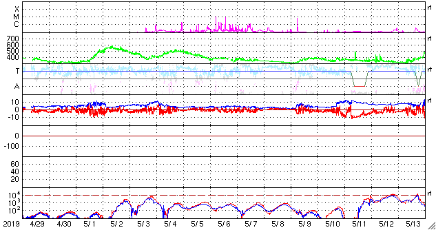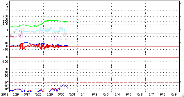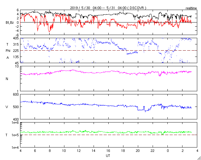 2019/ 5/29 12:31 太陽風の速度が500km/秒に上がり、磁気圏もやや活動的になっています。