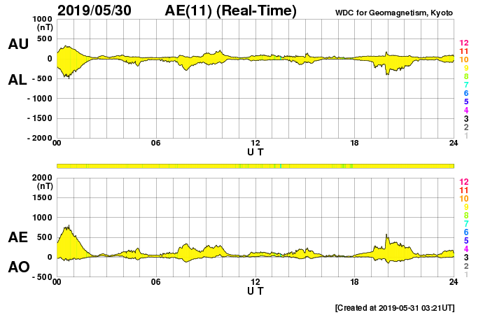 下段のAEグラフの値が高くなると、オーロラ活動が活発化しています。