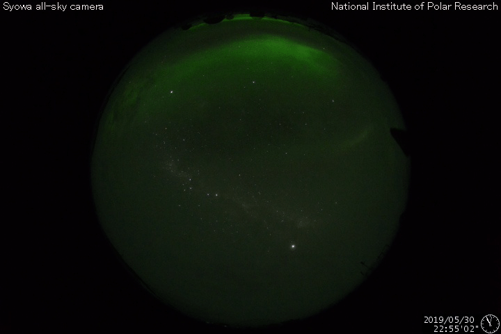 南極・昭和基地の全天カメラで、世界時30日23時に撮影されたオーロラ。