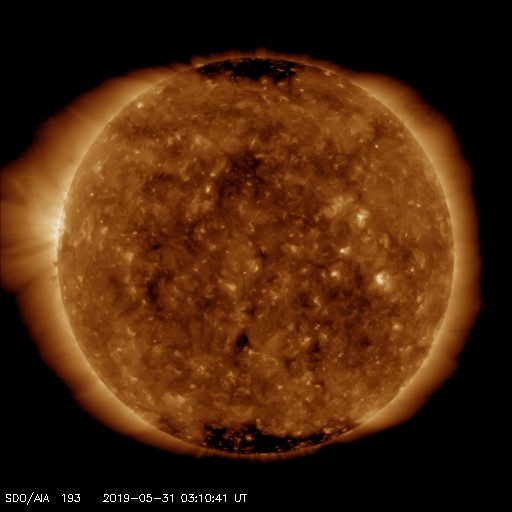 2019/ 5/30 12:47 高速太陽風が続き、磁気圏の活動もやや高まっています。小さい黒点が現れました。