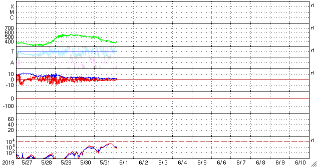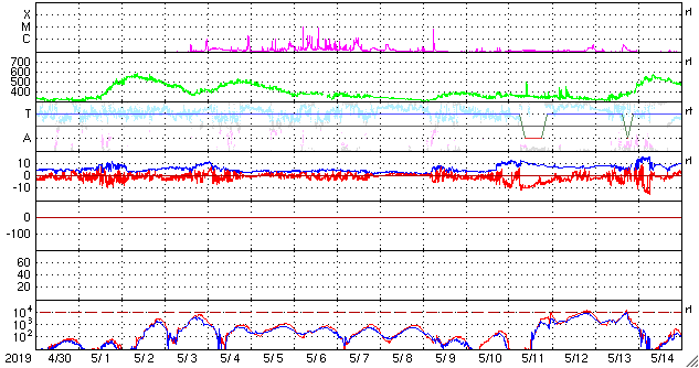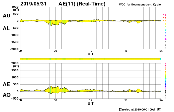 - 2019/ 5/29 12:31 太陽風の速度が500km/秒に上がり、磁気圏もやや活動的になっています。