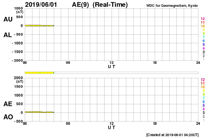 下段のAEグラフの値が高くなると、オーロラ活動が活発化しています。