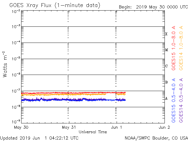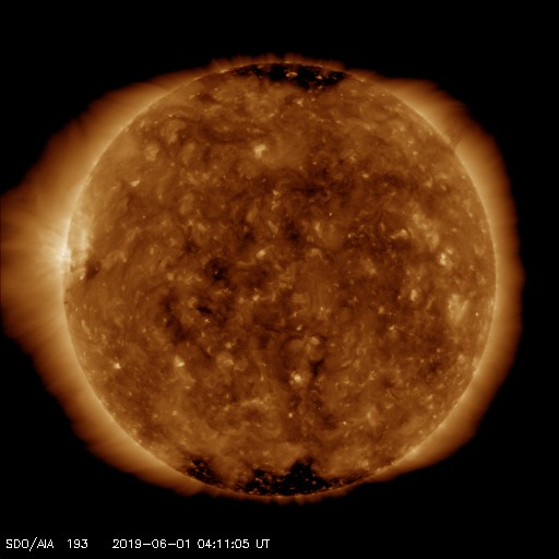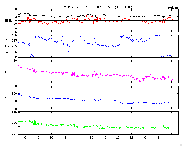 - 2019/ 5/31 12:22 高速の太陽風は続いています。太陽は無黒点です。