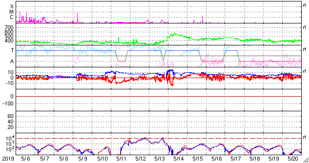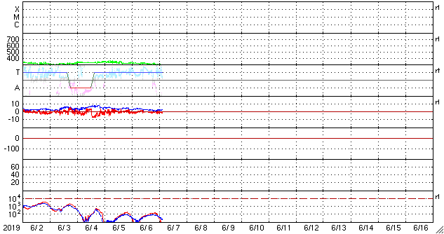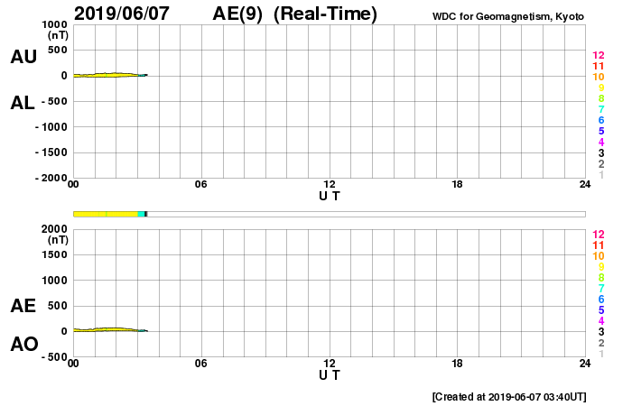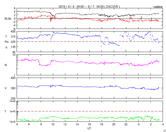 - 2019/ 6/ 5 12:28 低速の太陽風が続いています。磁場が南向きに振れて、磁気圏の活動を少し高めました。