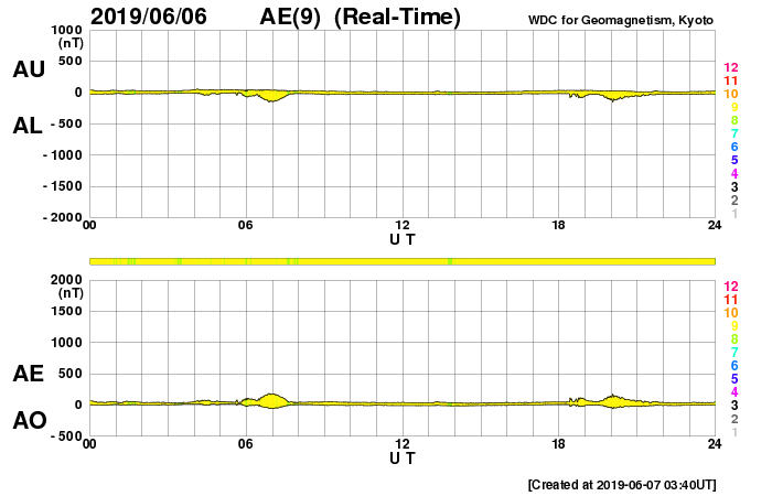 下段のAEグラフの値が高くなると、オーロラ活動が活発化しています。