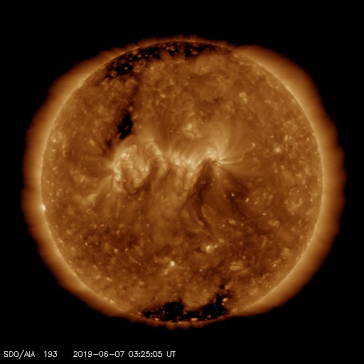 - 2019/ 6/ 6 12:43 低速の太陽風が続いています。5月の黒点数は 10.1 でした。