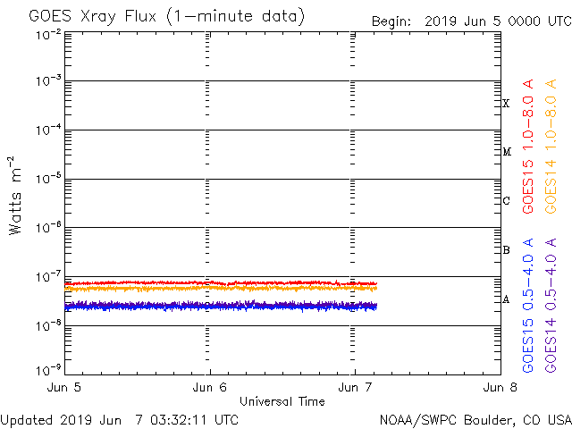 - 2019/ 6/ 3 12:55 太陽風の速度は更に下がっています。太陽は無黒点です。