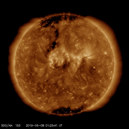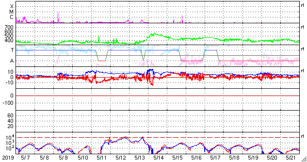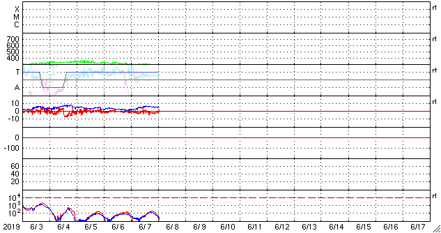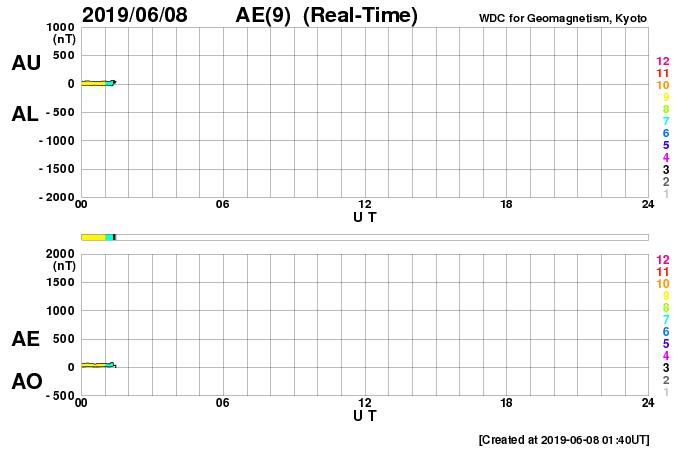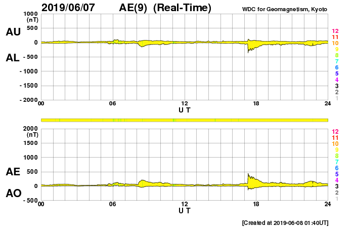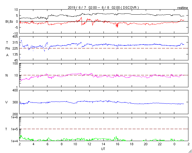 2019/ 6/ 8 10:35 更新 太陽風は280km/秒とかなり遅くなっています。太陽は無黒点です。 担当 篠原 太陽風の速度は、300km/秒に少し上がって、 再び280km/秒に下がるという小幅の変化をしています。 太陽風はかなり低速になっています。 一方、磁場強度は、5〜6nTと平均的な値に戻っています。 南北成分の変化は小さく、-2nTの弱い南寄りになる程度です。 磁気圏は穏やかで、 AE指数は、400nTの小規模の変化も起きていますが、 全体としては静かです。 SDO衛星AIA193では、 北極域からコロナホールが細く赤道域へ縦に伸びています。 27日前よりも領域は広がっている様なので、 今後の影響に注目してください。 太陽は、無黒点で穏やかな状態が続いています。 ![]() SDO衛星のAIA193カメラによる太陽コロナの様子 (c) SDO (NASA) ![]() SDO衛星による太陽の可視光写真 (c) SDO (NASA) ![]() DSCOVRが観測した太陽風の磁場(1番上の枠、黒線は全体の強度、赤線は南北成分) および、太陽風の密度(3番目の紫線)、速度(4番目の青線) (c) データ:NOAA/SWPC、作図:宇宙天気ニュース ![]() AE指数(速報値) 下段のAEグラフの値が高くなると、オーロラ活動が活発化しています。 (c) 京都大学WDC ![]() ![]() 27日の太陽周期に合わせたデータプロット 太陽が同じ面を地球に向けていた27日前の変化から、今後を予想することができます。 (c) 作図:宇宙天気ニュース