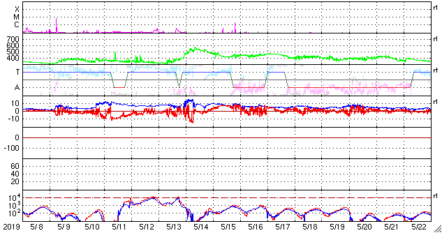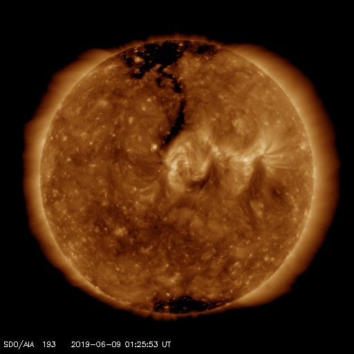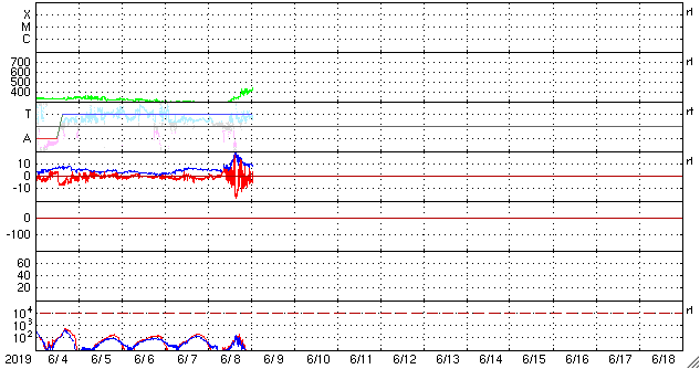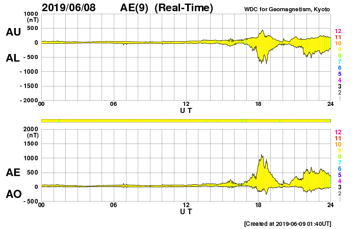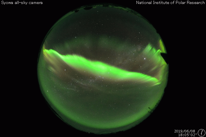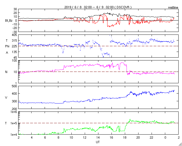 2019/ 6/ 9 10:37 更新 太陽風の高まりが到来して、磁気圏の活動を高めています。 担当 篠原 昨夜から太陽風に変化が始まり、 磁場強度は、深夜にかけて18nTヘ強まって、 その後10nTヘ下がりましたが、強まった状態が続き、 280km/秒に下がっていた速度は、 半日ほどかけてゆっくりと上昇して、 現在は430km/秒と平均的な速度に達しています。 27日周期の図で、 前周期の5月13〜14日に始まっていた太陽風の高まりが、 1日ほど早く回帰したのかもしれません。 前周期は550km/秒まで速度が高まっているので、 この後も速度は上がっていく可能性があります。 太陽風磁場の南北成分は、 磁場が強まった頃に南北に大きく振れて、 -15nTの大きな南向きの変化が2時間近く発生しています。 速度はまだ低速でしたが、磁気圏の活動は高まって、 AE指数は1100nTの大きな変化を記録しています。 その頃の昭和基地の全天カメラの動画を掲載します。 空全体を雄大なオーロラの輝きが飾っています。 AE指数はこの後も600nTの中規模の変化が起きていて、 この頃の昭和基地の写真にも素晴らしいオーロラが見えています。 現在の太陽風磁場の南北成分は、 振れ幅は小さくなって、-3nT程度の南向きの変化が見えています。 磁気圏の活動は、規模としては小さくなりそうです。 太陽は無黒点です。 X線グラフも変化は見られません。 ![]() 南極・昭和基地の全天カメラで、世界時8日18時に撮影されたオーロラ。 (c) 国立極地研究所、(動画加工 : 宇宙天気ニュース) ![]() SDO衛星のAIA193カメラによる太陽コロナの様子 (c) SDO (NASA) ![]() SDO衛星による太陽の可視光写真 (c) SDO (NASA) ![]() DSCOVRが観測した太陽風の磁場(1番上の枠、黒線は全体の強度、赤線は南北成分) および、太陽風の密度(3番目の紫線)、速度(4番目の青線) (c) データ:NOAA/SWPC、作図:宇宙天気ニュース ![]() AE指数(速報値) 下段のAEグラフの値が高くなると、オーロラ活動が活発化しています。 (c) 京都大学WDC ![]() ![]() 27日の太陽周期に合わせたデータプロット 太陽が同じ面を地球に向けていた27日前の変化から、今後を予想することができます。 (c) 作図:宇宙天気ニュース