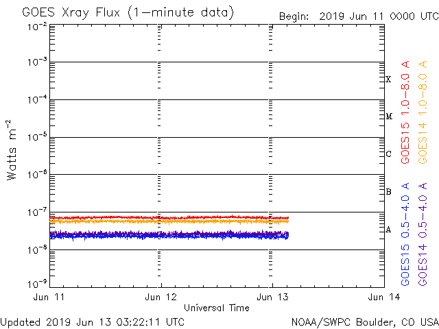 - 2019/ 6/12 12:02 太陽風の速度は300km/秒まで下がっています。太陽は無黒点です。