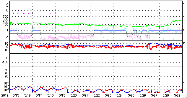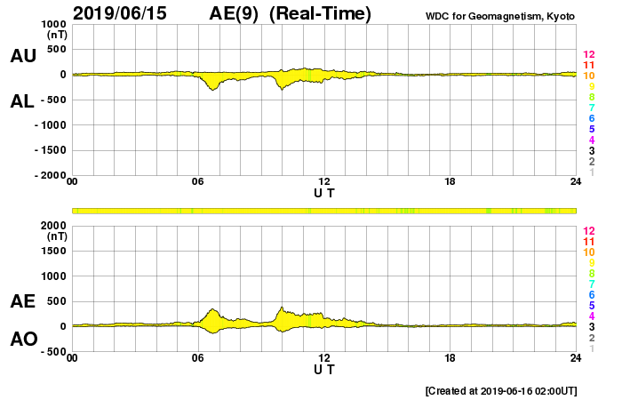 (c) SDO (NASA) ![]() SDO衛星による太陽の可視光写真 (c) SDO (NASA) ![]() DSCOVRが観測した太陽風の磁場(1番上の枠、黒線は全体の強度、赤線は南北成分) および、太陽風の密度(3番目の紫線)、速度(4番目の青線) (c) データ:NOAA/SWPC、作図:宇宙天気ニュース ![]() AE指数(速報値) 下段のAEグラフの値が高くなると、オーロラ活動が活発化しています。 (c) 京都大学WDC ![]() ![]() 27日の太陽周期に合わせたデータプロット 太陽が同じ面を地球に向けていた27日前の変化から、今後を予想することができます。 (c) 作図:宇宙天気ニュース
