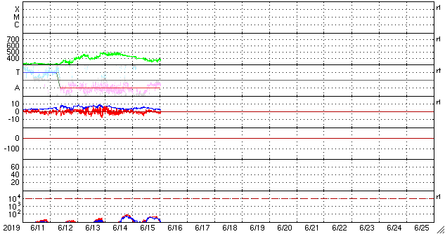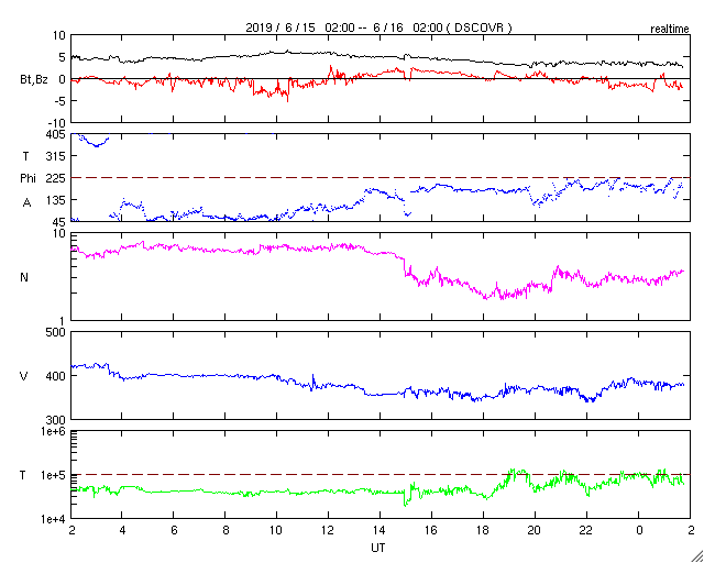 2019/ 6/16 11:01 更新 太陽風はやや低速になっています。太陽は無黒点です。 担当 篠原 太陽風の速度は、昨夜に400km/秒台を割り、 370km/秒とやや低速になっています。 磁場強度は、昨日のニュースの後に5nTに上がり、 また3nTに下がっています。 太陽風は穏やかです。 磁場の南北成分は、 全体としては小さい変化になっています。 AE指数も基本的には穏やかで、 磁場が南向きに少し強まった頃に 300nTの小規模の変化が起きている程度です。 SDO衛星AIA193では、 南半球の淡いコロナホールが更に西に進んで、 影響の始まる目安の位置に近付いています。 太陽風の高まりはやって来るでしょうか。 太陽は無黒点が続いています。 SDO衛星AIA193の北西端近く(右上)に 明るい小さい領域ができていますが、 黒点ができる程に発達するでしょうか。