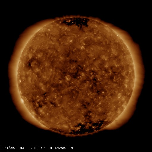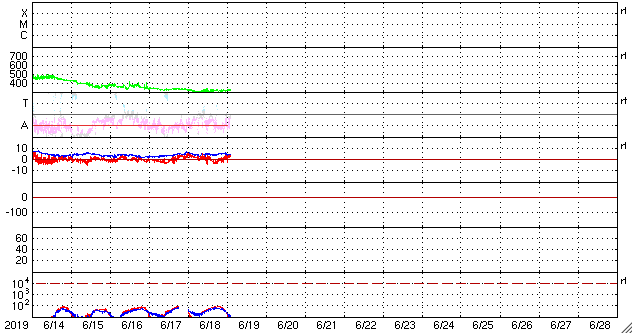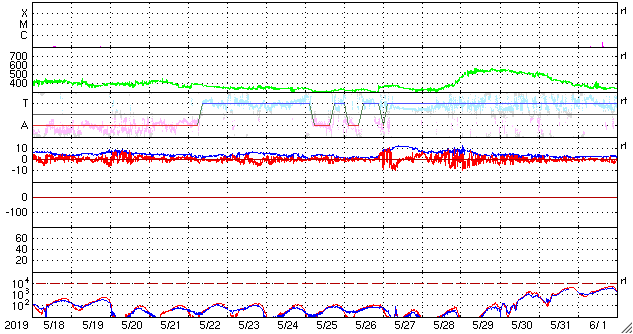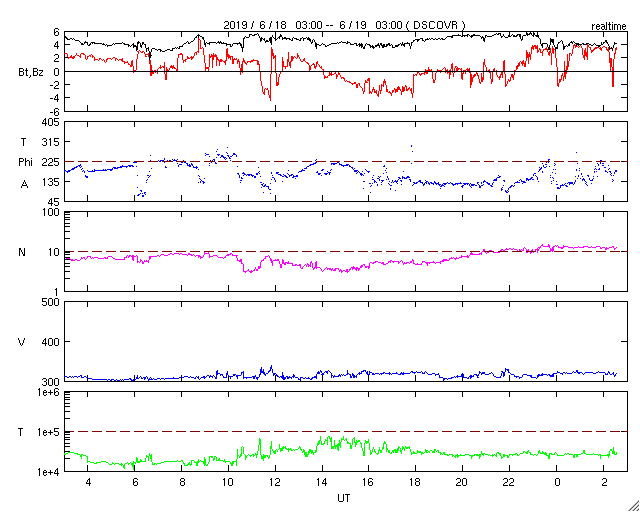 2019/ 6/19 11:43 更新 低速の太陽風が続き、磁気圏も穏やかです。 担当 篠原 太陽風の速度は、 昨日のニュースの後、300km/秒近くまで下がり、 以降、320km/秒付近で推移しています。 低速の風が続いています。 磁場強度は、4〜5nTと平均的な状態が続いています。 南北成分は北寄りの傾向が続き、 一時的に南向きになった時間帯に、 AE指数のグラフに小規模の変化が起きていますが、 その他は静かな状態が続いています。 SDO衛星AIA193の太陽写真は、 全体がぼんやりと光っていて、 はっきりとしたコロナホールは、極域に見られる程度です。 この後も低速の太陽風が続きそうです。 太陽は今日も無黒点です。 X線グラフも変化はありません。 ![]() SDO衛星のAIA193カメラによる太陽コロナの様子 (c) SDO (NASA) ![]() SDO衛星による太陽の可視光写真 (c) SDO (NASA) ![]() DSCOVRが観測した太陽風の磁場(1番上の枠、黒線は全体の強度、赤線は南北成分) および、太陽風の密度(3番目の紫線)、速度(4番目の青線) (c) データ:NOAA/SWPC、作図:宇宙天気ニュース ![]() AE指数(速報値) 下段のAEグラフの値が高くなると、オーロラ活動が活発化しています。 (c) 京都大学WDC ![]() ![]() 27日の太陽周期に合わせたデータプロット 太陽が同じ面を地球に向けていた27日前の変化から、今後を予想することができます。 (c) 作図:宇宙天気ニュース