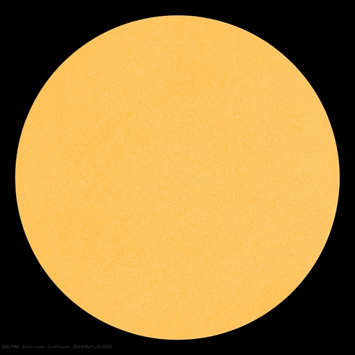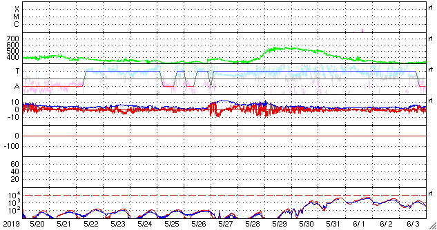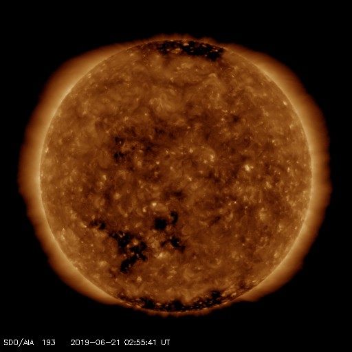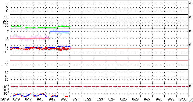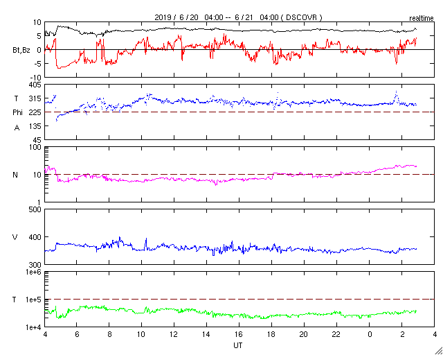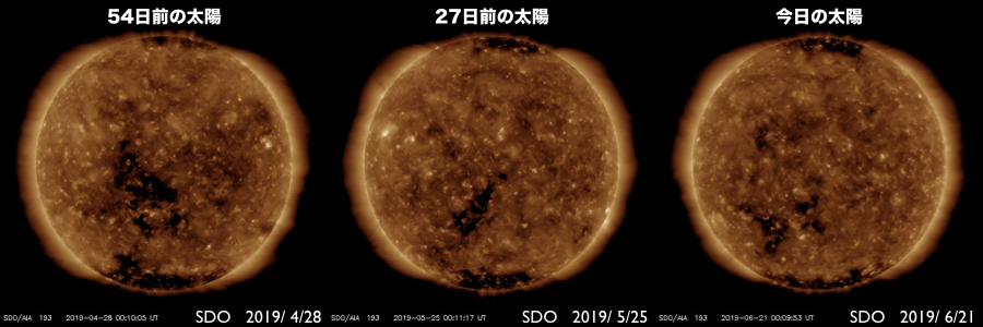 2019/ 6/21 12:05 更新 太陽風は低速の風が続いています。 担当 篠原 太陽風は、350〜360km/秒の低速の風が続いています。 磁場強度は、7nTと少し強まった状態です。 磁場の南北成分の変化は、全体としては小幅で、 AE指数は小規模の変化が起きている程度です。 SDO衛星AIA193の太陽コロナ写真では、 太陽の中央線の南半球側にコロナホールが近付いています。 この領域は、27日周期の図の前周期の5月28〜29日に始まる 高速太陽風の発生源と思われます。 今回も同様の回帰をすると考えると、 来週の24〜25日頃に太陽風速度の変化が始まりそうです。 一方、54日前、27日前の写真と比べると、 コロナホールは次第に縮小している様にも見えます。 今回はどの様な変化になるでしょうか。 太陽は無黒点です。 静かな状態が続いています。
